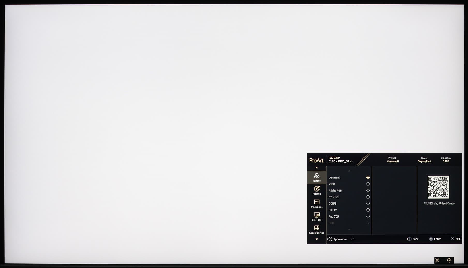 Asus ProArt Display PA27JCV имеет большой яркий экран с диагональю 27 дюймов, основанный на матрице IPS с разрешением 5К (5120×2880). Высокое разрешение, хорошая цветопередача и функциональное оснащение позволяют рекомендовать данное устройство отображения для работы с графикой и видео, в частности для монтажа в разрешении 4К, а также для работы с большим количеством текстовой и графической информации. Этот монитор можно использовать в качестве док-станции для ноутбука, так как выходной мощности порта USB-C в 96 Вт должно хватать в большинстве случаев. Особенно отметим глубоко матовую поверхность матрицы с улучшенными антибликовыми свойствами. Остается только сожалеть о том, что производитель не позаботился о снижении эффекта высветления черного при отклонении по диагонали, который в случае использованной матрицы IPS выражен в значительной степени.