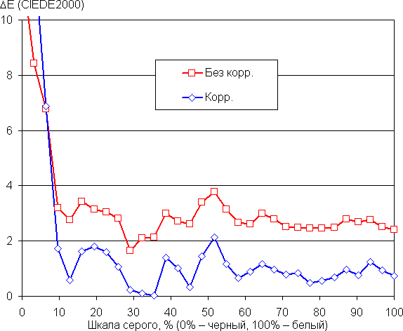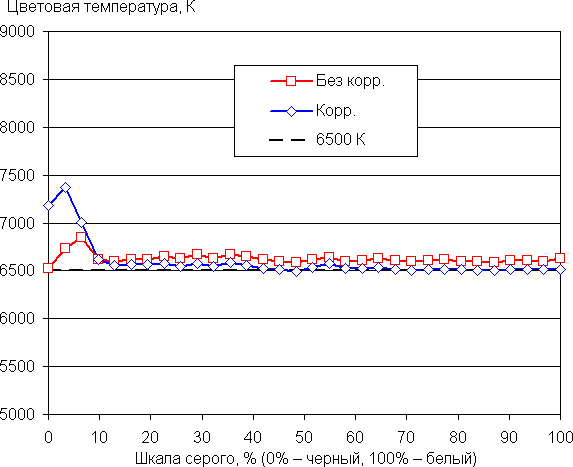 Самый близкий к черному диапазон можно не учитывать, так как в нем цветопередача не так важна, а погрешность измерения цветовых характеристик высокая. Цветовой баланс во всех двух случаях хороший, так как цветовая температура близка к стандартным 6500 К и отклонение от спектра абсолютно черного тела (ΔE) ниже 4 единиц. При этом оба параметра мало изменяются на различных участках шкалы серого, что улучшает визуальное восприятие цветового баланса. Простой корректировкой цветовой баланс удается улучшить до уровня профессиональных моделей (ΔE < 3).