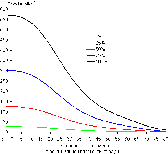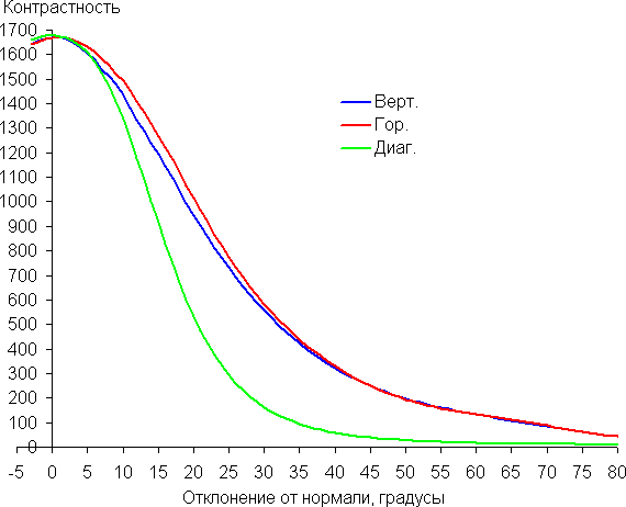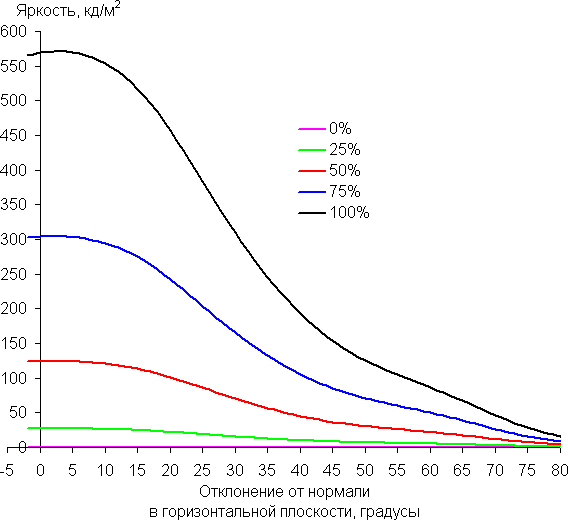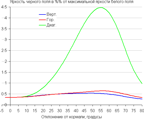 Углы обзора по снижению яркости неширокие. При отклонении в диагональном направлении яркость черного поля начинает резко возрастать уже при 20°-30° отклонения от перпендикуляра к экрану, и возрастает максимум до примерно 4,5% от максимальной яркости белого поля. Даже для матрицы типа IPS это очень высокое значение. Если сидеть не очень далеко от экрана, то черное поле по углам будет заметно светлее, чем в центре, и иметь желтоватый оттенок. Контрастность в диапазоне углов ±82° вплотную приближается к отметке 10:1 только при отклонении по диагонали, но все равно остается выше этого значения.