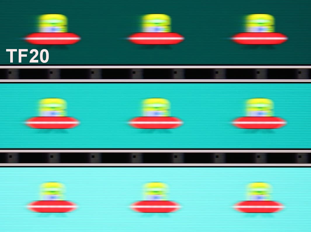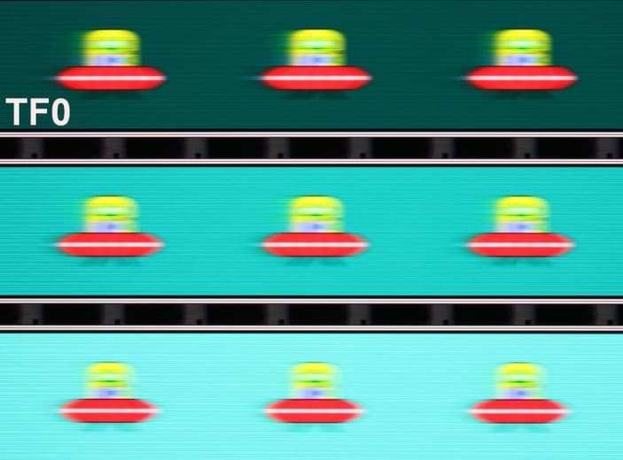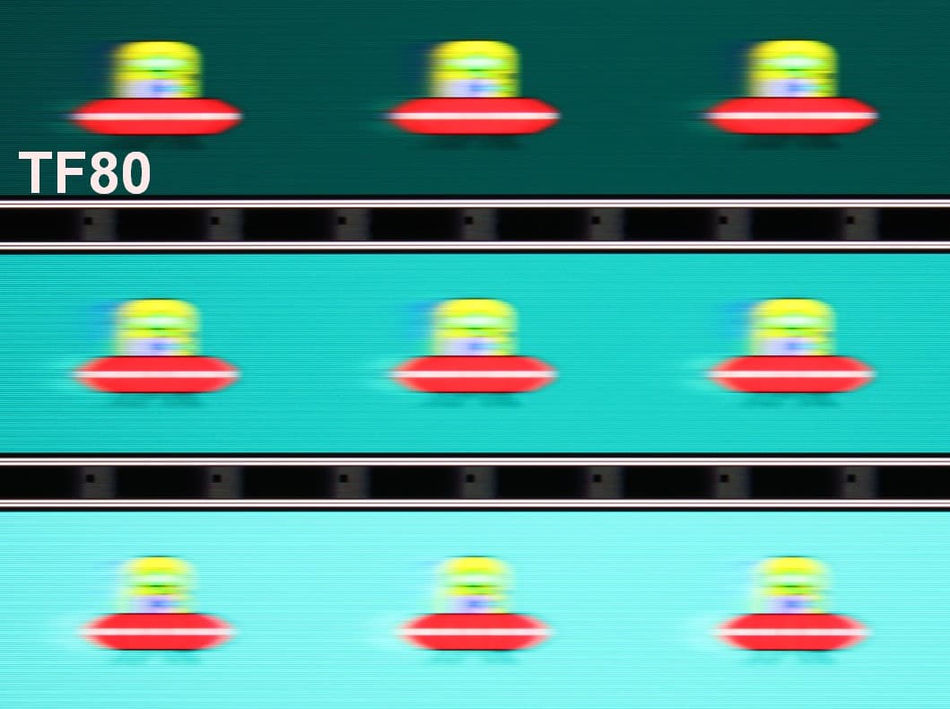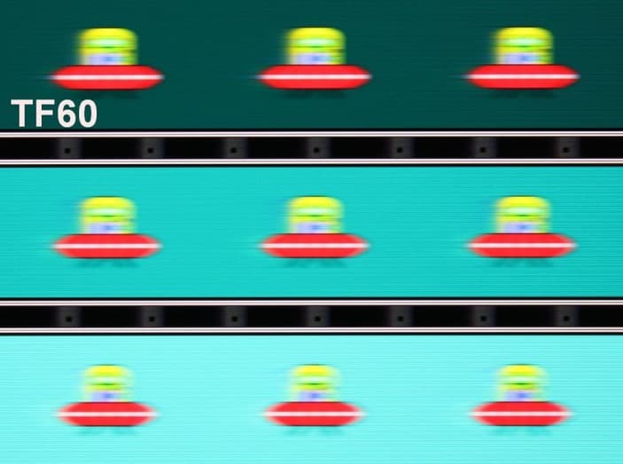 Для наглядного представления о том, что на практике означает такая скорость матрицы, и какие могут быть артефакты от разгона, приведем серию снимков, полученных с помощью движущейся камеры. Такие снимки показывают, что видит человек, если он следит глазами за двигающимся на экране объектом. Описание теста приведено тут, страница с самим тестом тут. Использовались рекомендованные установки (скорость движения 960 пиксель/с, выдержка 1/15 с). На фотографиях указаны значения Trace Free.