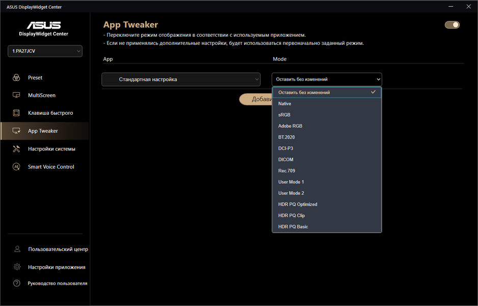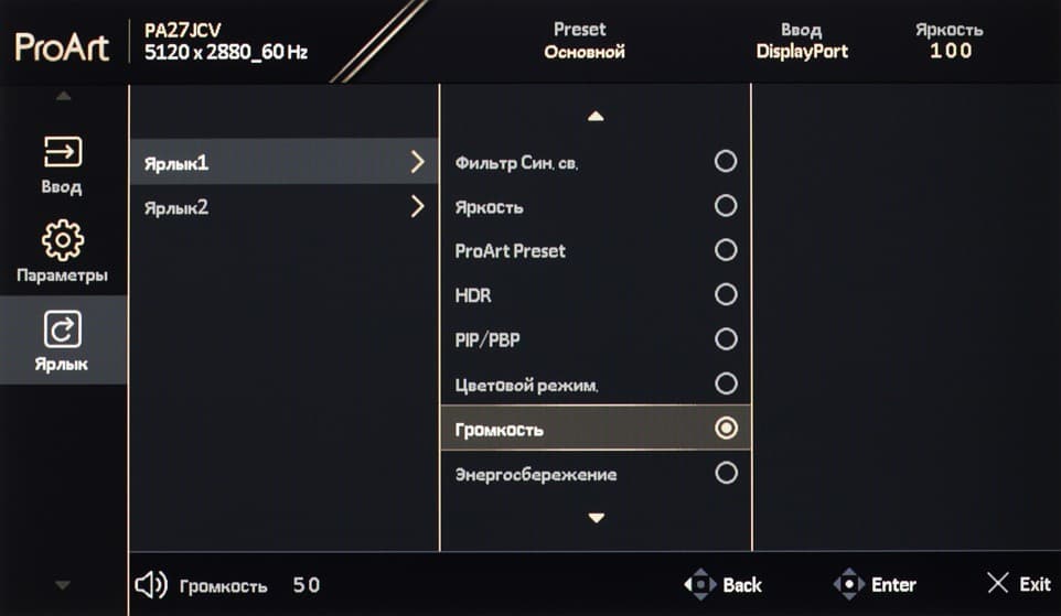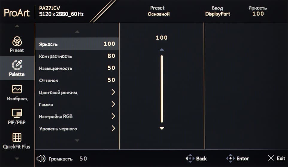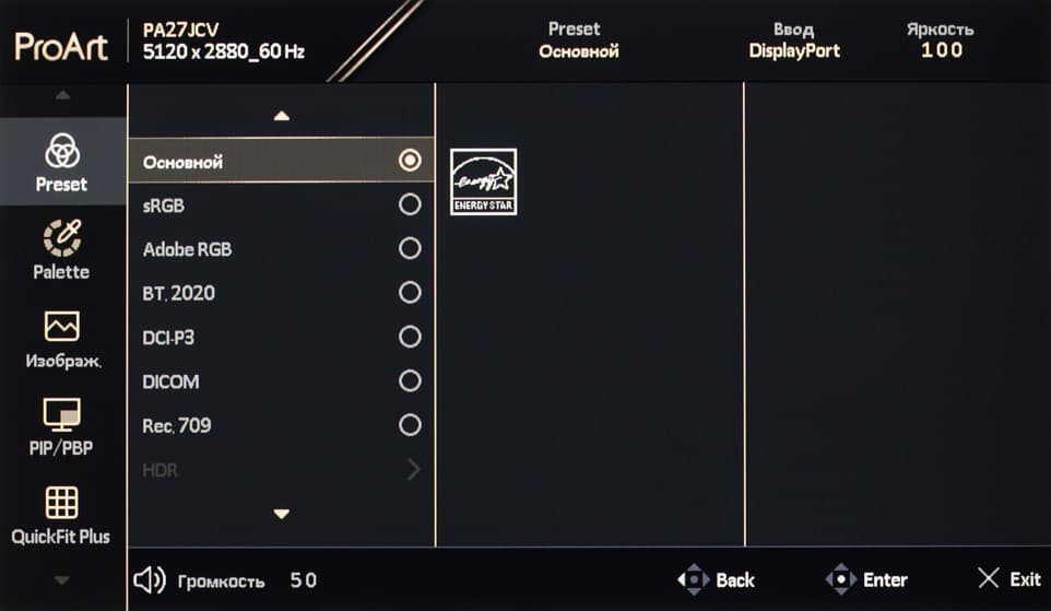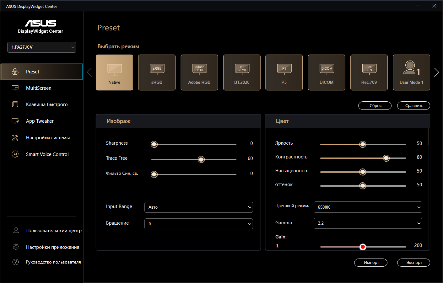 Есть несколько предустановленных профилей, притом в ряде из них часть настроек недоступны для изменения, может быть заблокирована даже регулировка яркости подсветки.