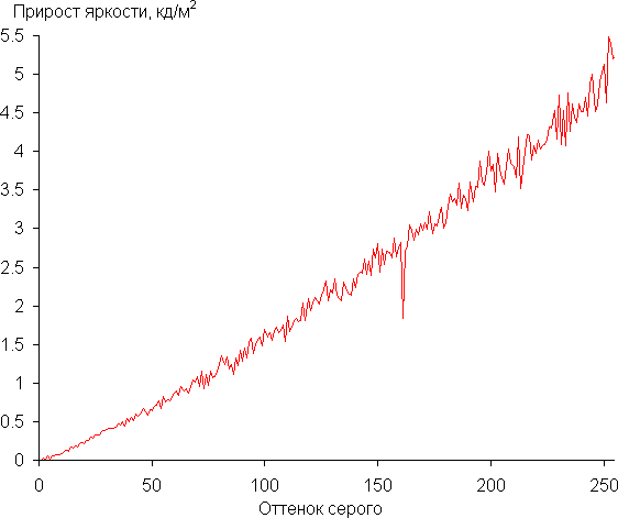 Мы измерили яркость 256 оттенков серого (от 0, 0, 0 до 255, 255, 255) при Гамма = 2,2. График ниже показывает прирост (не абсолютное значение!) яркости между соседними полутонами: