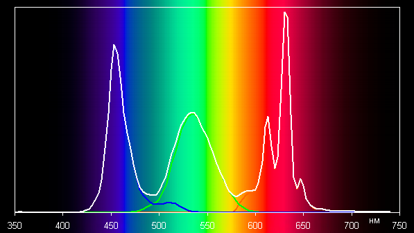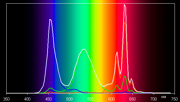 Ниже приведен спектр для белого поля (белая линия), наложенный на спектры красного, зеленого и синего полей (линии соответствующих цветов) в случае исходного цветового охвата: