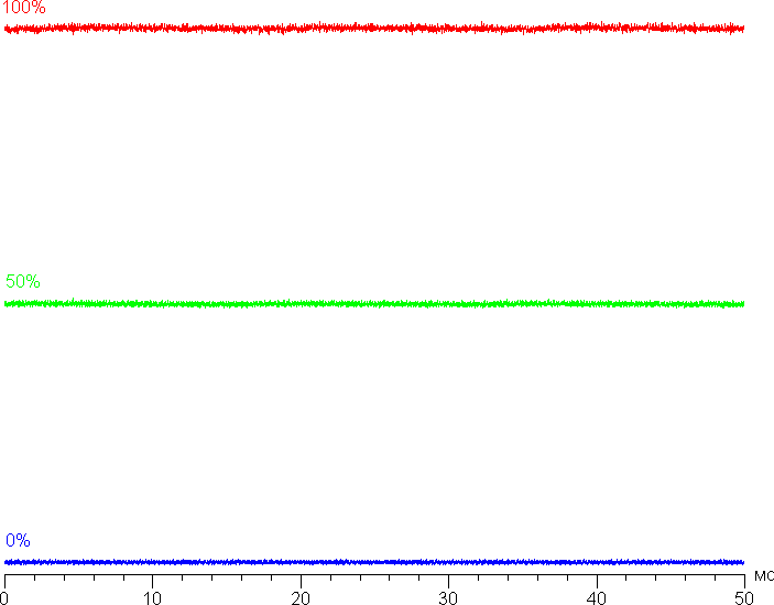 На любом уровне яркости модуляция подсветки отсутствует, что исключает видимое мерцание экрана. Для тех, кто привык распознавать знакомое сокращение, уточним: ШИМ отсутствует. В доказательство приведем графики зависимости яркости (вертикальная ось) от времени (горизонтальная ось) при различных значениях настройки яркости: