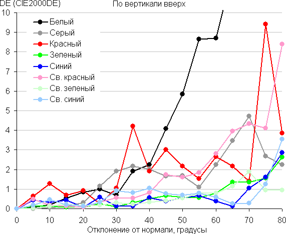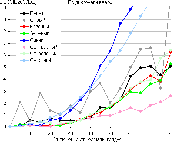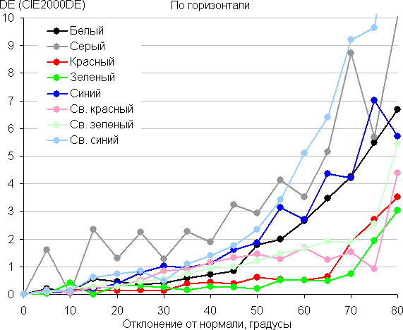 Для количественной характеристики изменения цветопередачи мы провели колориметрические измерения для белого, серого (127, 127, 127), красного, зеленого и синего, а также светло-красного, светло-зеленого и светло-синего полей во весь экран с использованием установки, подобной той, что применялась в предыдущем тесте. Измерения проводились в диапазоне углов от 0° (датчик направлен перпендикулярно к экрану) до 80° с шагом в 5°. Полученные значения интенсивностей были пересчитаны в ΔE относительно замера каждого поля при перпендикулярном положении датчика относительно экрана. Результаты представлены ниже: