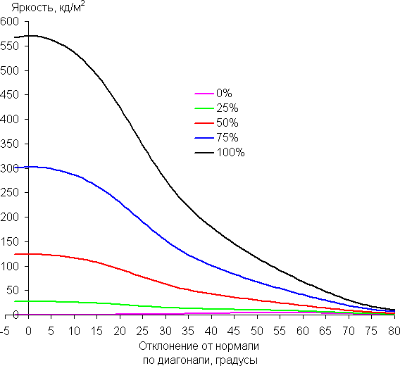 Чтобы выяснить, как меняется яркость экрана при отклонении от перпендикуляра к экрану, мы провели серию измерений яркости черного, белого и оттенков серого в центре экрана в широком диапазоне углов, отклоняя ось датчика в вертикальном, горизонтальном и диагональном (от центра в угол для формата 16:9) направлениях.