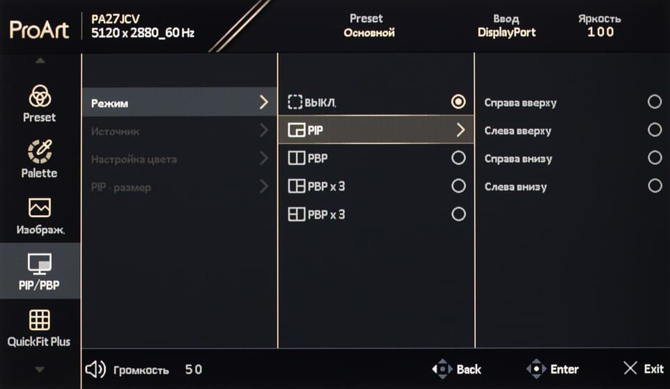 Присутствуют функции картинка-в-картинке (PIP) и картинка-рядом-с-картинкой (PBP). Во втором случае возможен вывод изображения от двух или трех источников.
