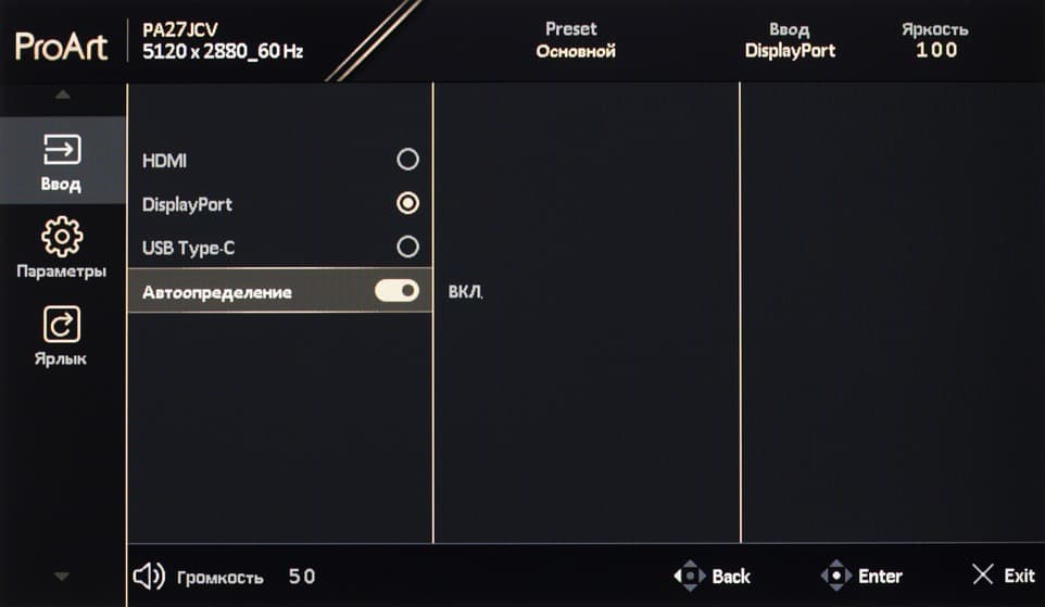 Представление об оснащенности интерфейсами дает таблица с характеристиками в начале статьи. Монитор имеет три цифровых входа, поддерживающих прием видеосигнала, — DisplayPort, HDMI и USB-C. Выбор входа осуществляется вручную, также есть отключаемая функция автоматического поиска сигнала на входах.