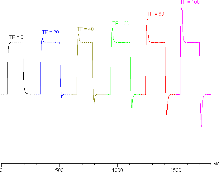 При значениях Trace Free выше 0 на графиках некоторых переходов появляются характерные всплески яркости, например, так выглядят графики для перехода между оттенками 70% и 90% (значения Trace Free приведены над графиками; по вертикали — яркость, по горизонтали — время, для наглядности графики выстроены последовательно):