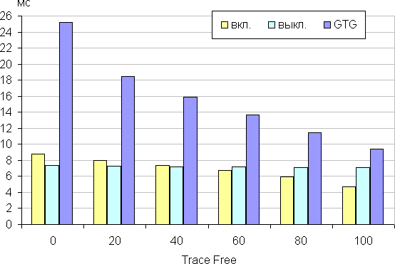 Время отклика зависит от значения настройки Trace Free (компания Asus очень любит давать настройкам свои оригинальные названия, пользователю от этого ничуть не легче разбираться в них), которая управляет разгоном матрицы. При 0 разгона нет, при 100 разгон максимальный (шаг регулировки равен 20). График ниже показывает, как меняется время включения и выключения при переходе черный-белый-черный (столбики вкл. и выкл.), а также среднее суммарное время для переходов между полутонами (столбики GTG):