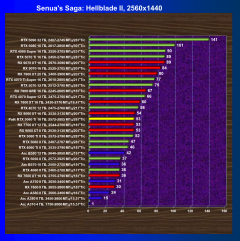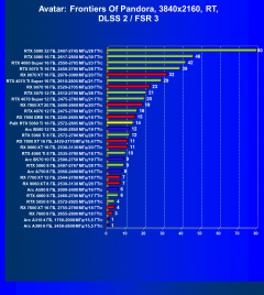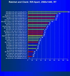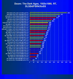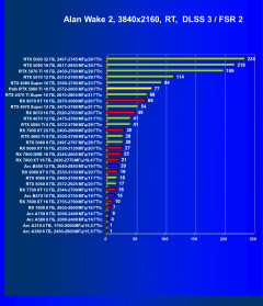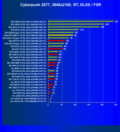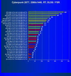- Результаты тестов со включенной аппаратной трассировкой лучей и/или DLSS/FSR/XeSS в разрешениях 1920×1080, 2560×1440 и 3840×2160