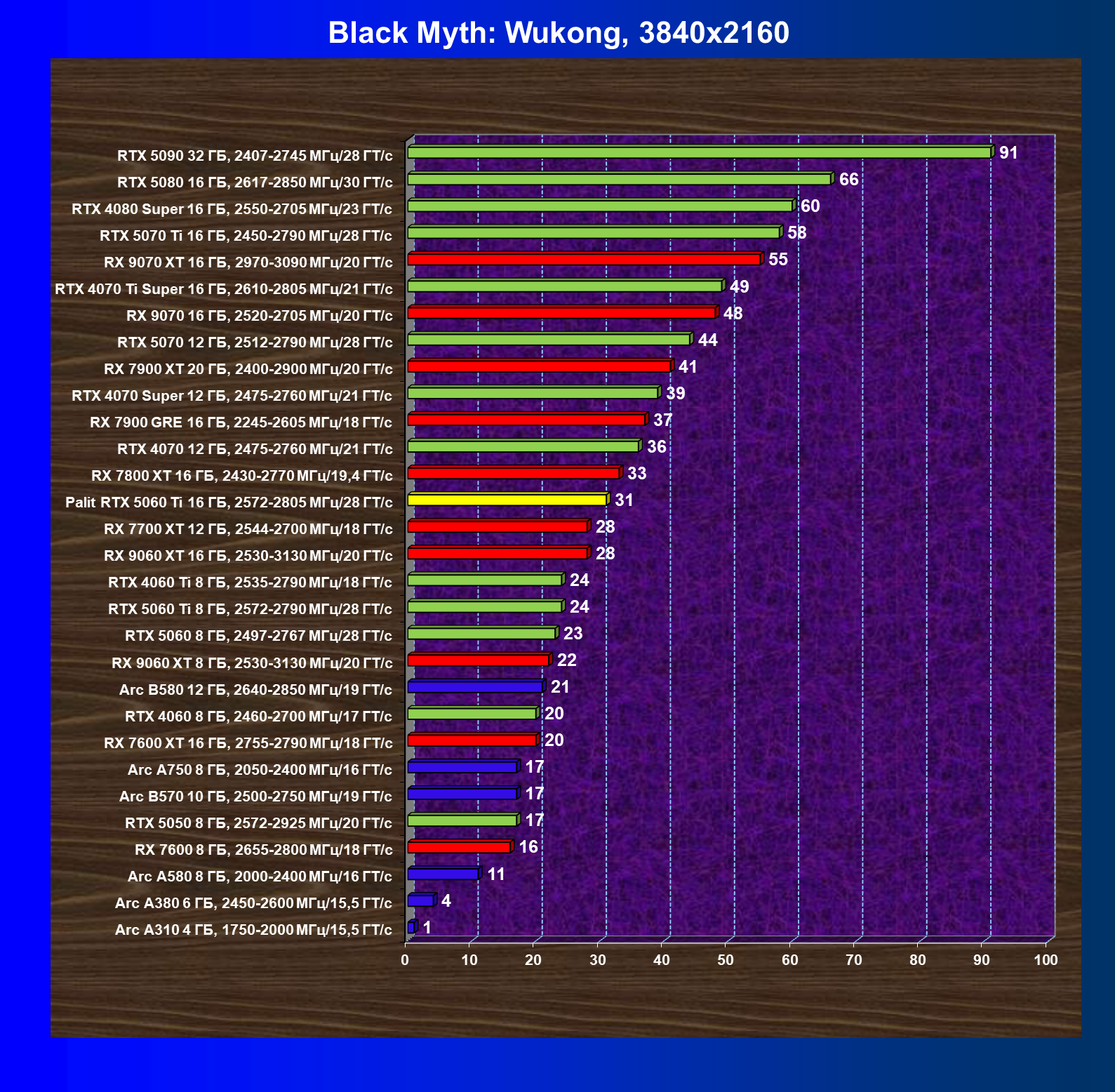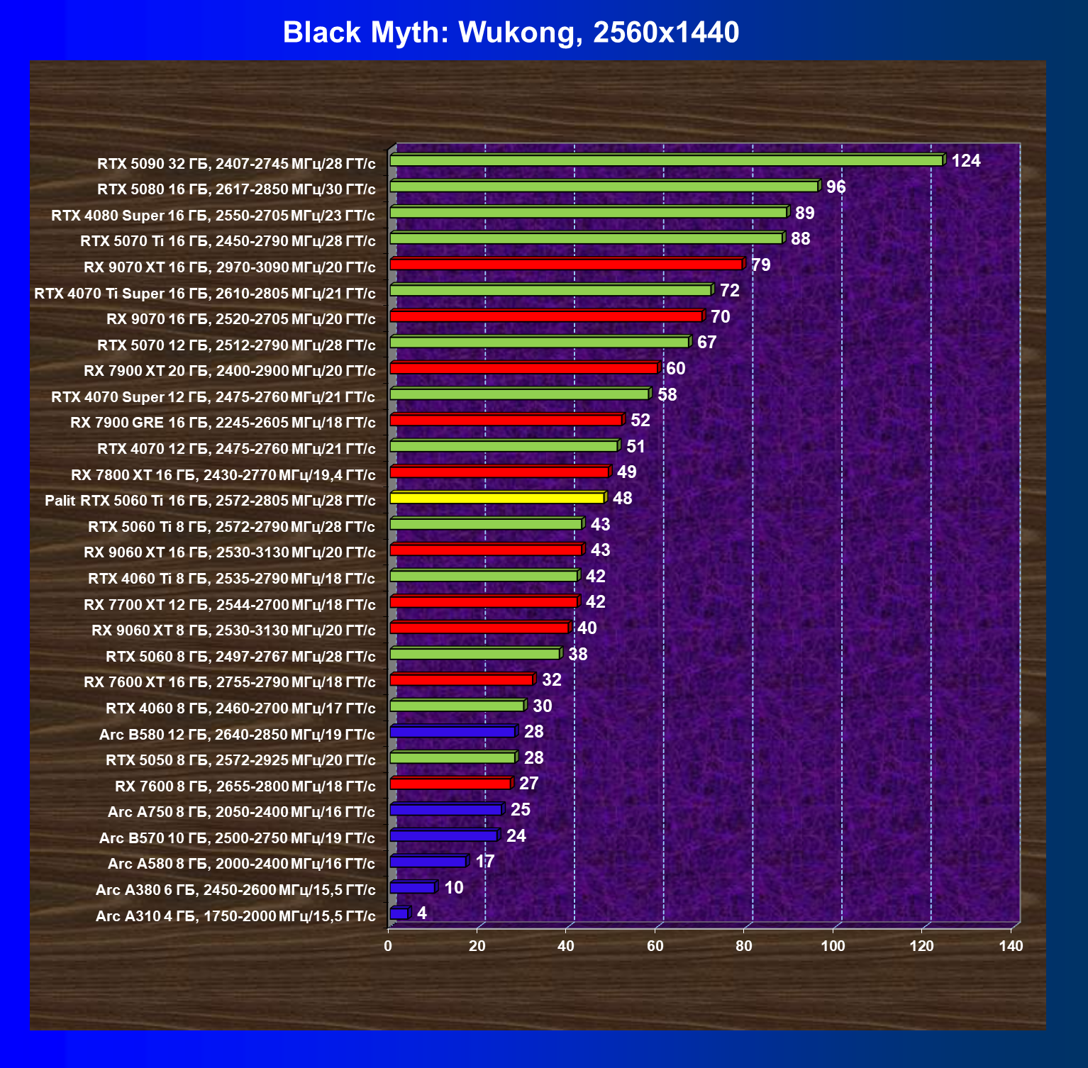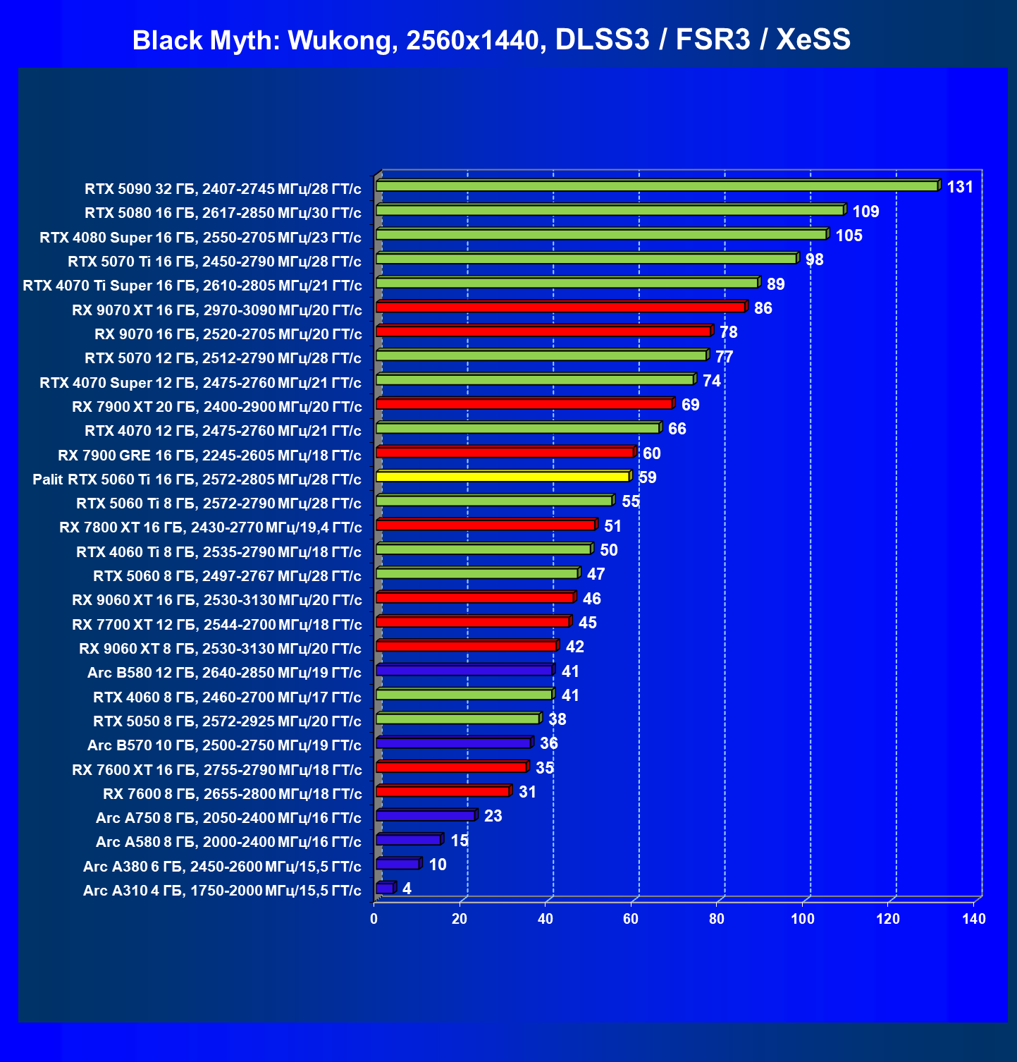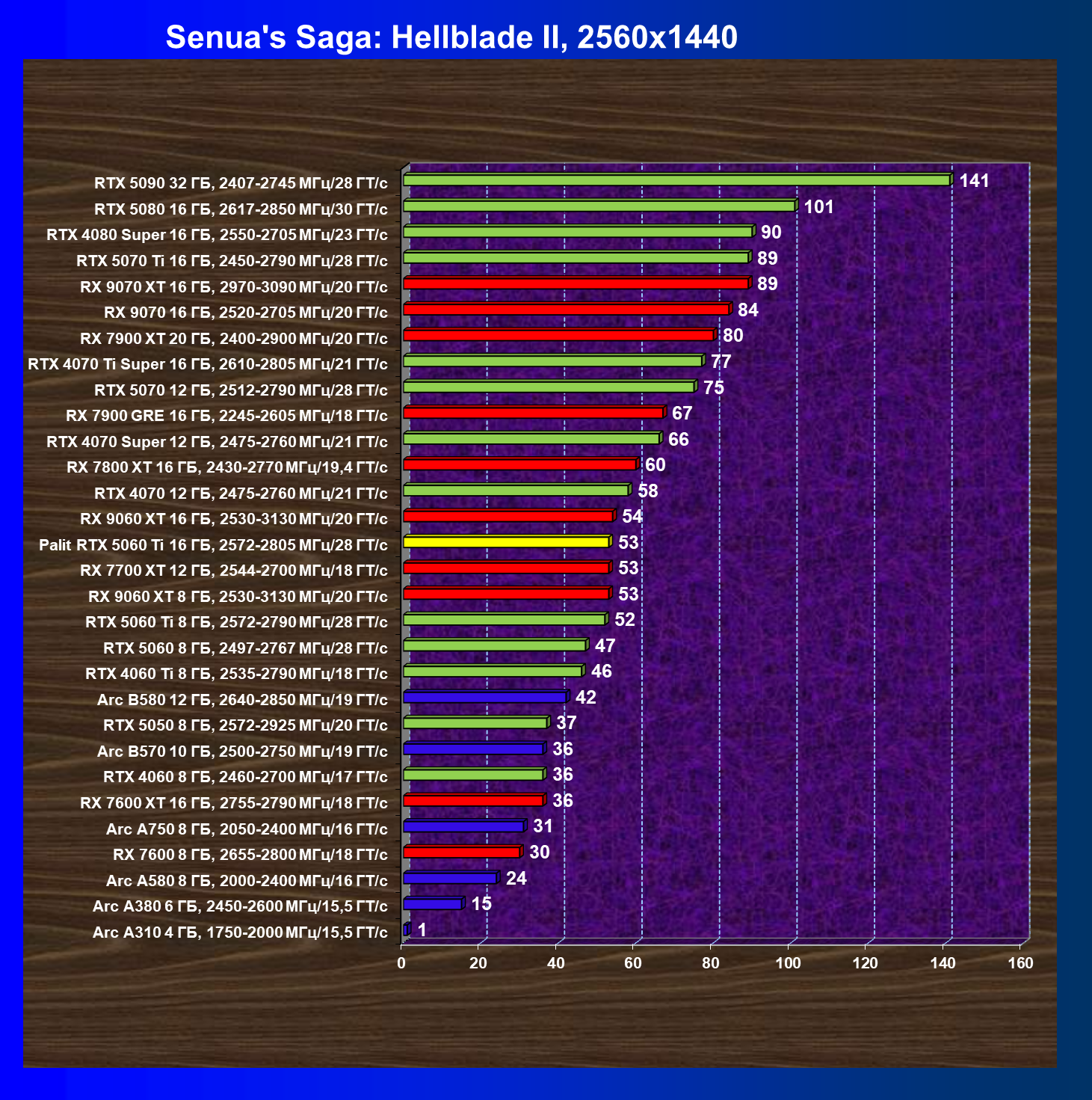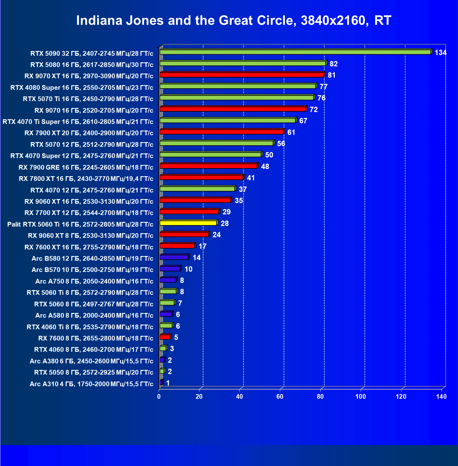 | 13 | Palit RTX 5060 Ti 16 ГБ, 2572—2805 МГц/28 ГТ/с | 273 | 1311 | 48 000 |