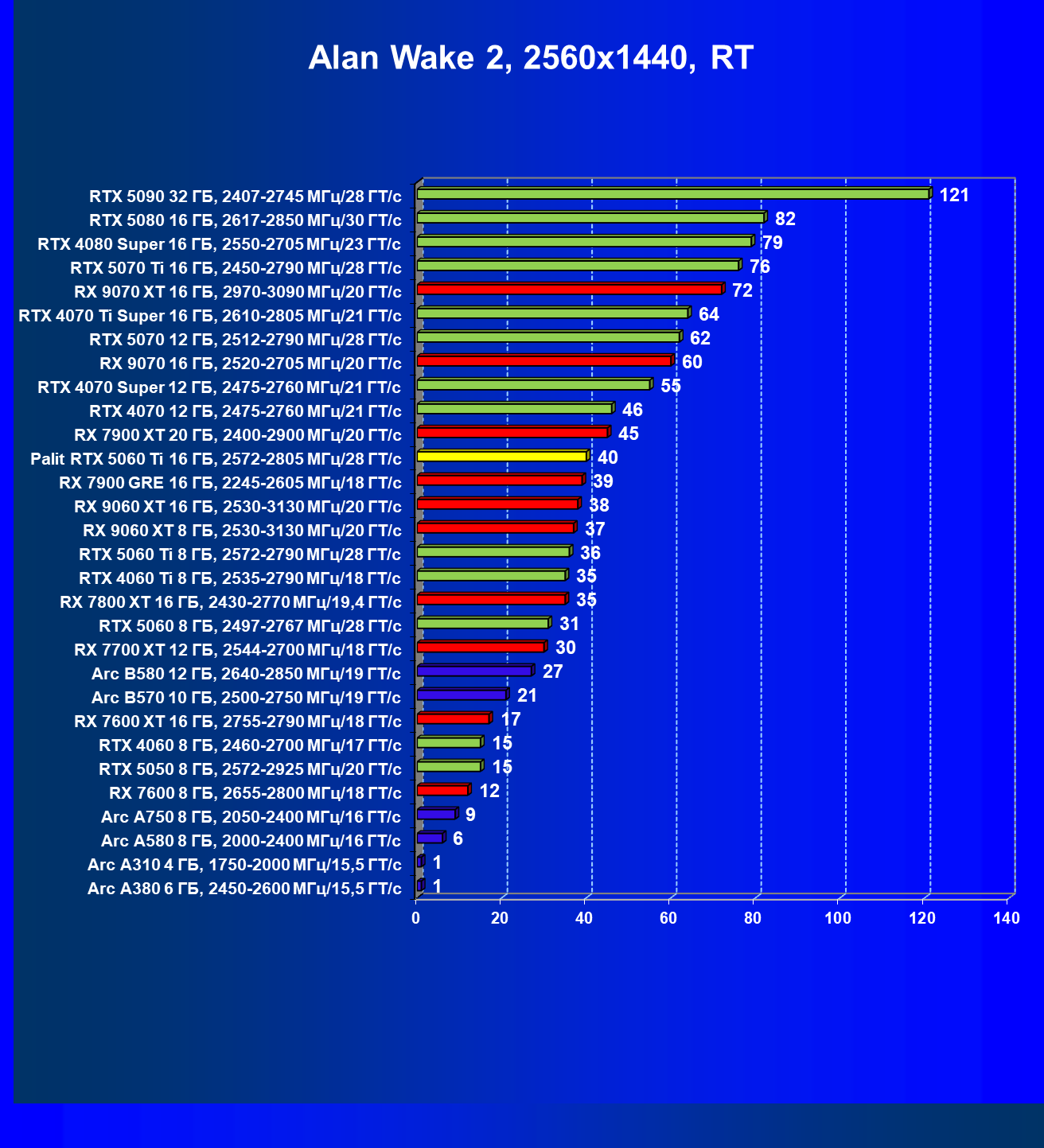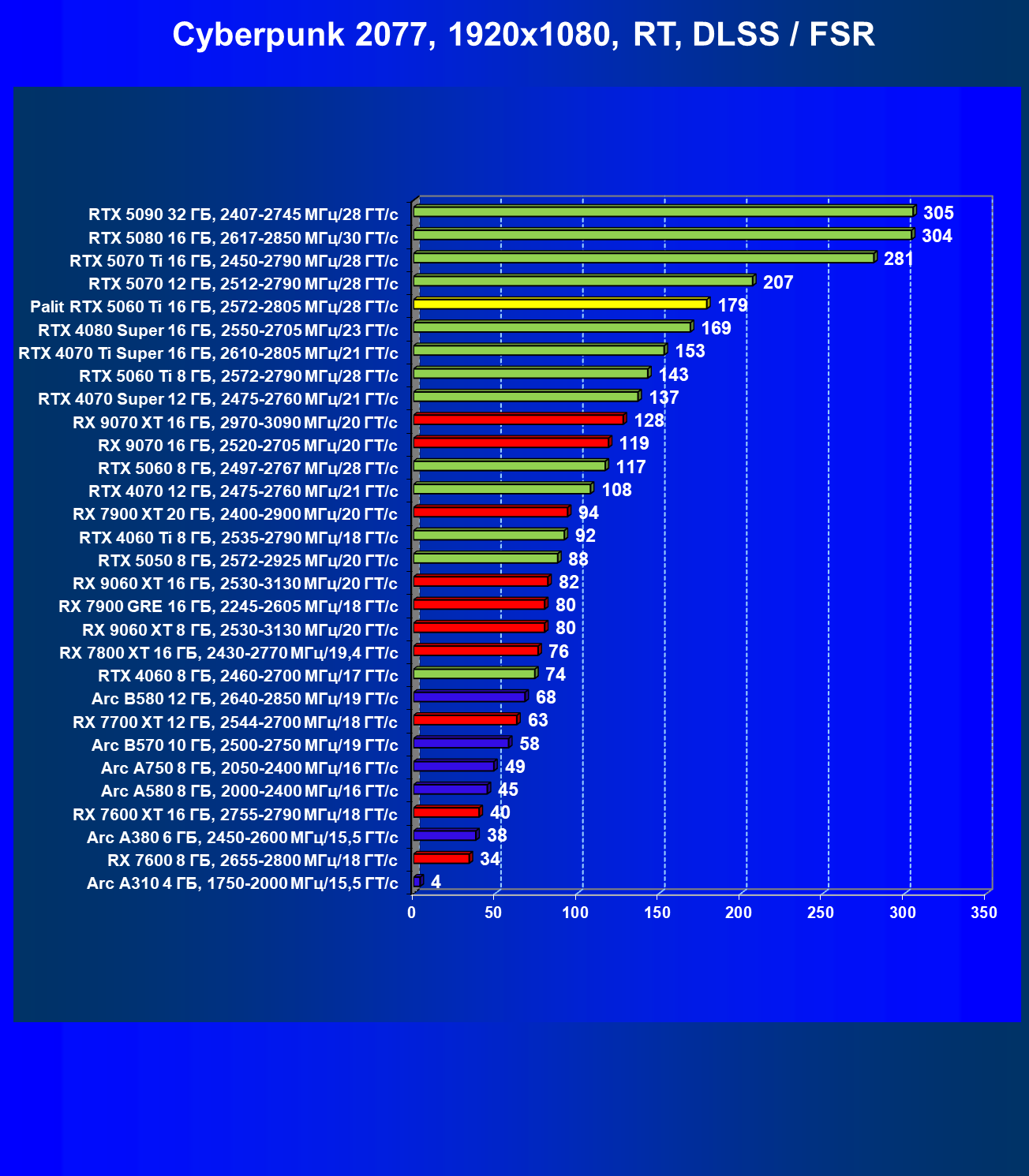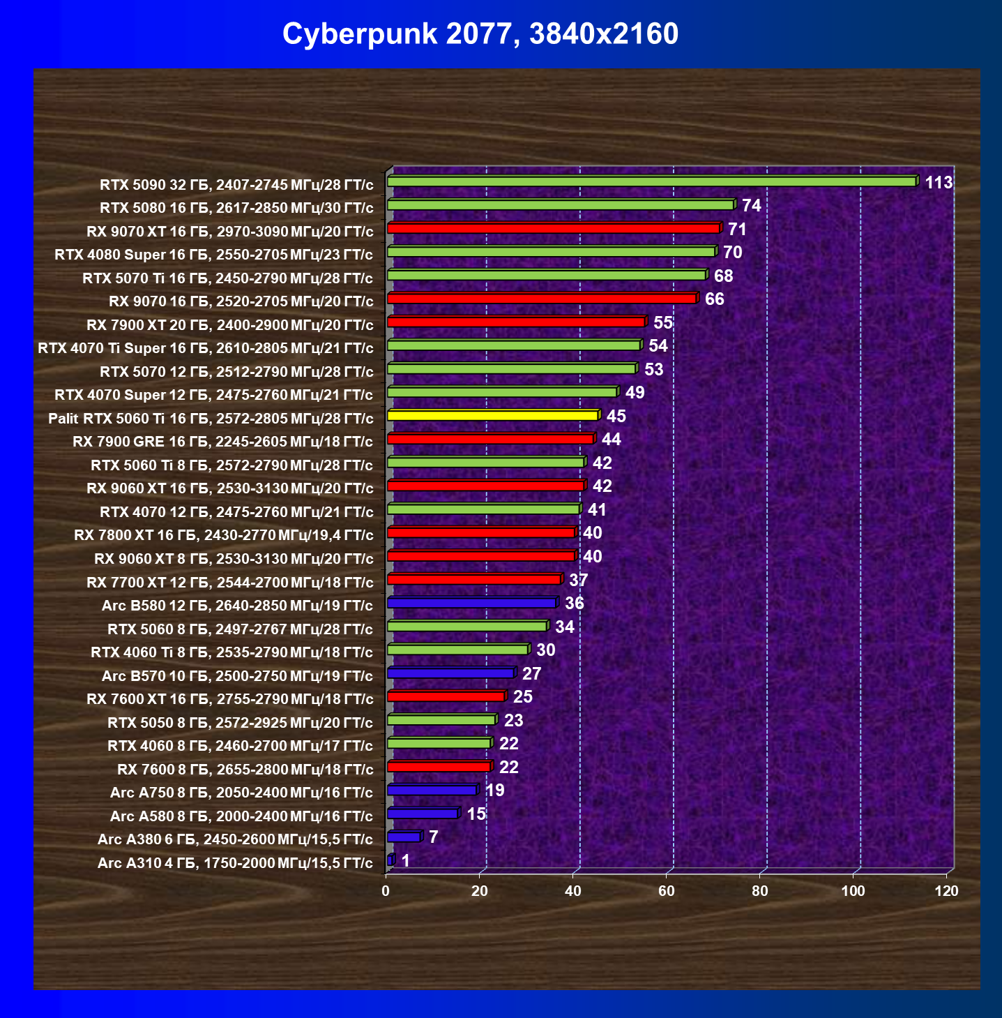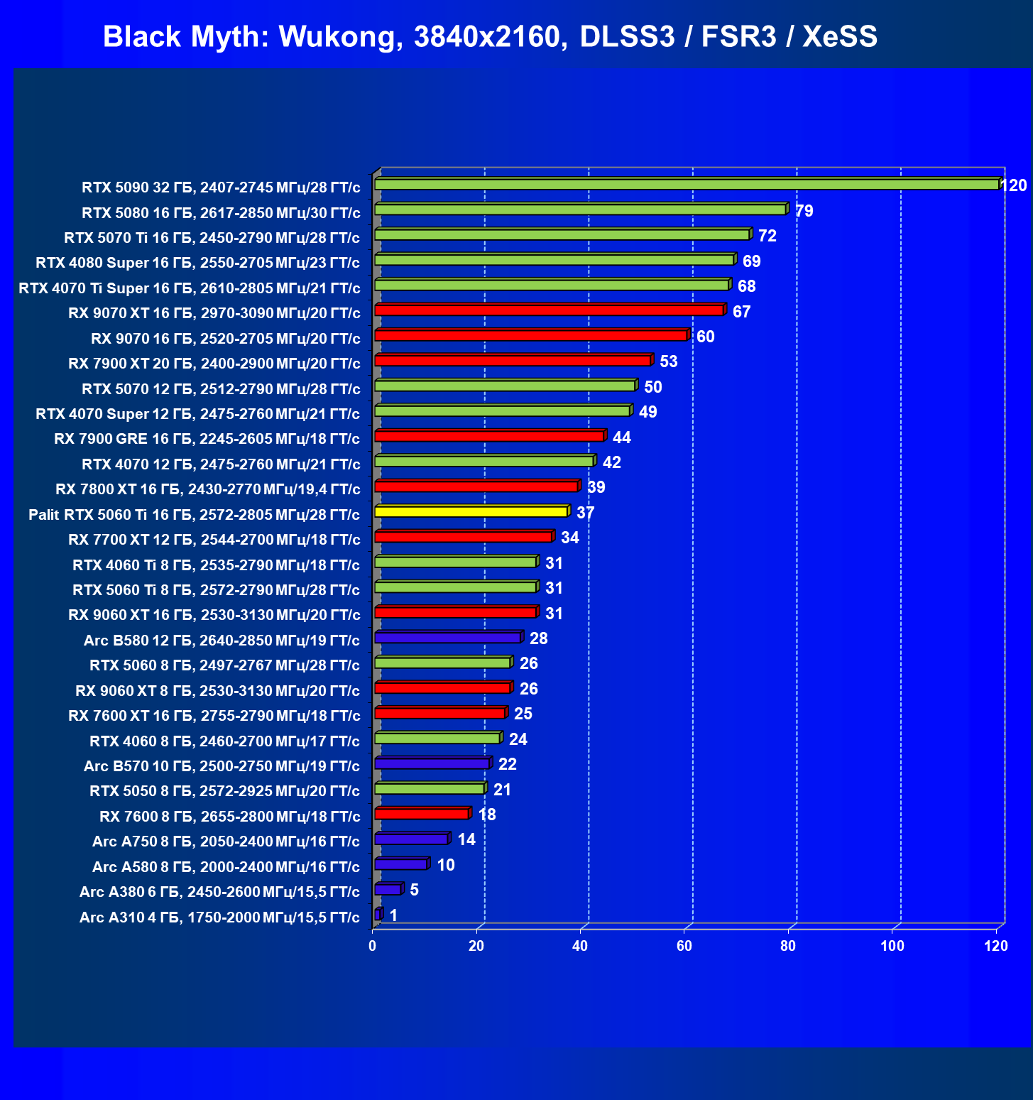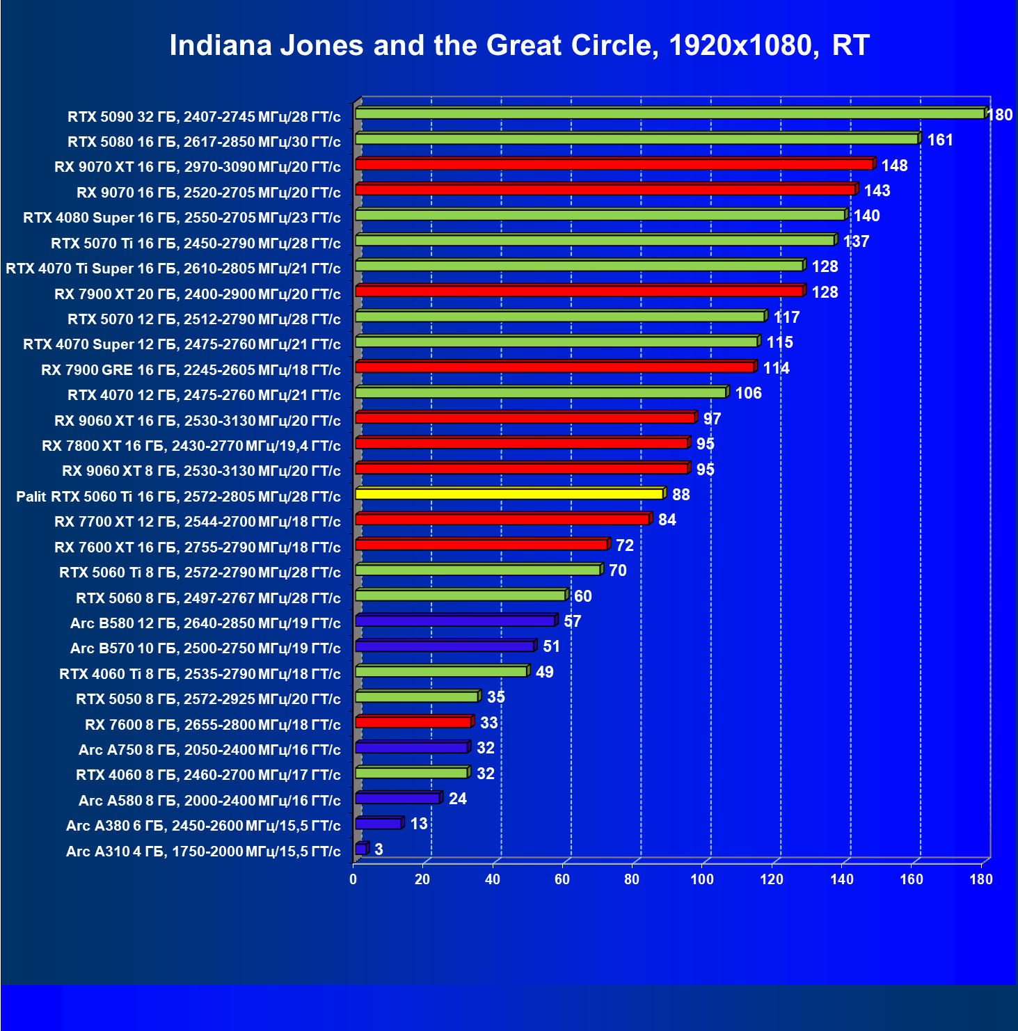 | 13 | Palit RTX 5060 Ti 16 ГБ, 2572—2805 МГц/28 ГТ/с | 273 | 1311 | 48 000 |