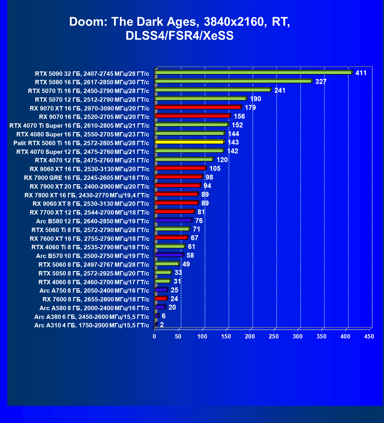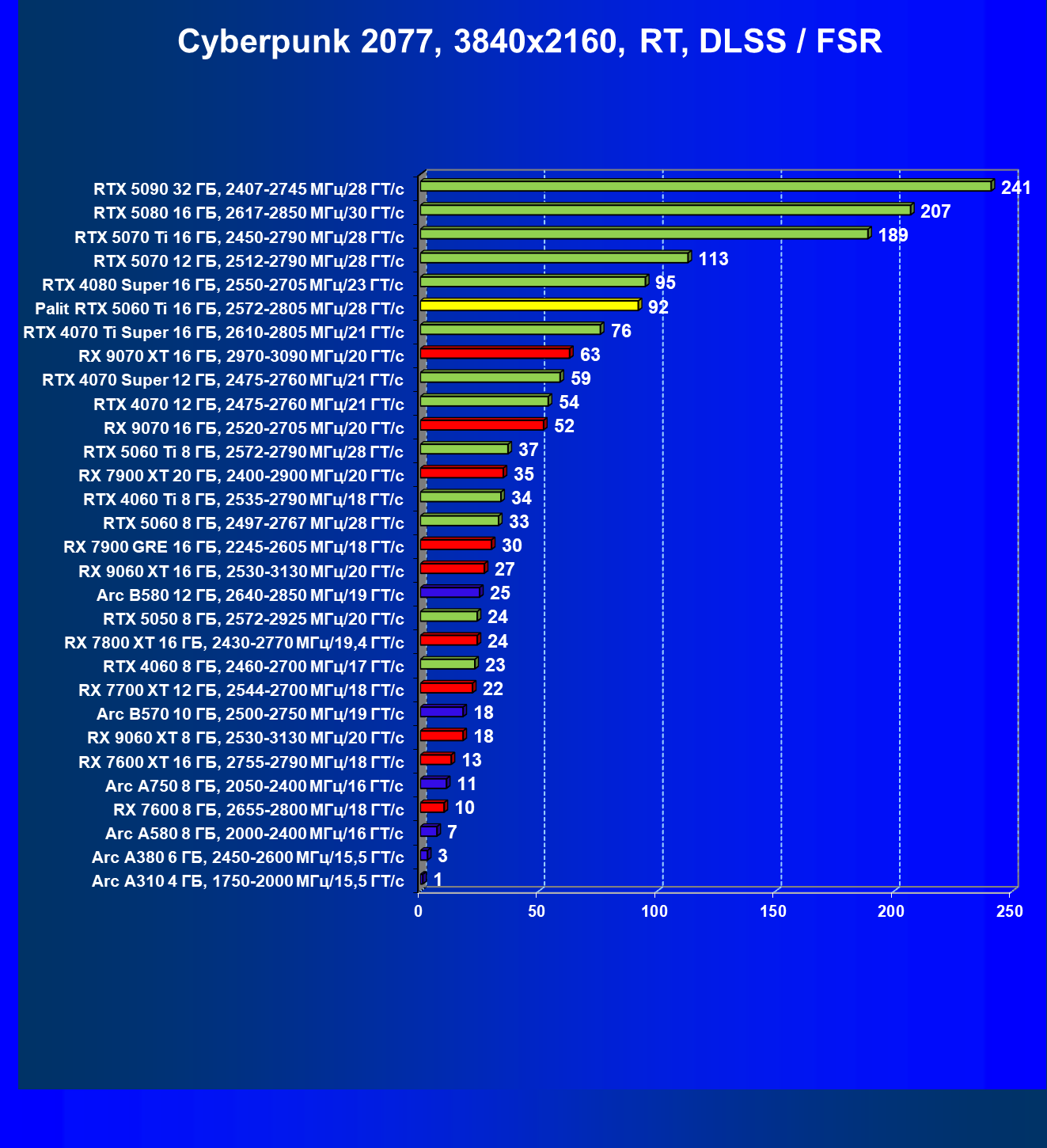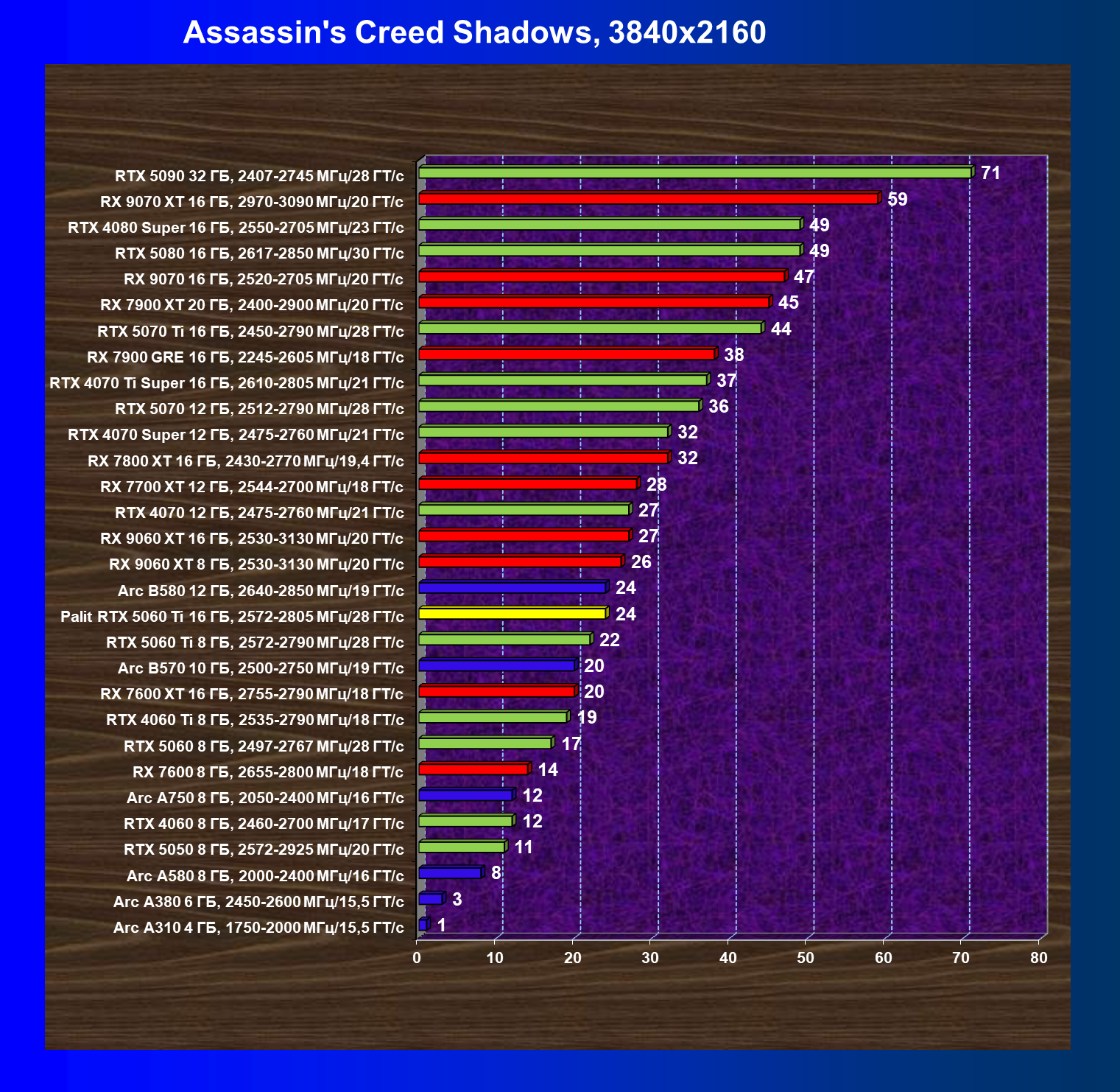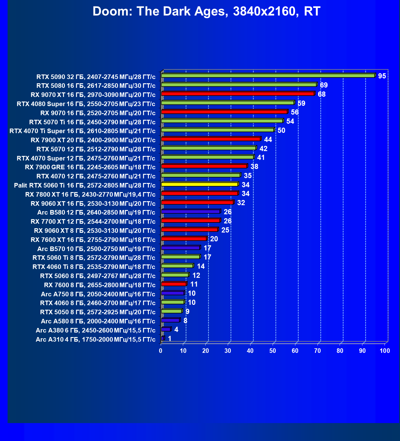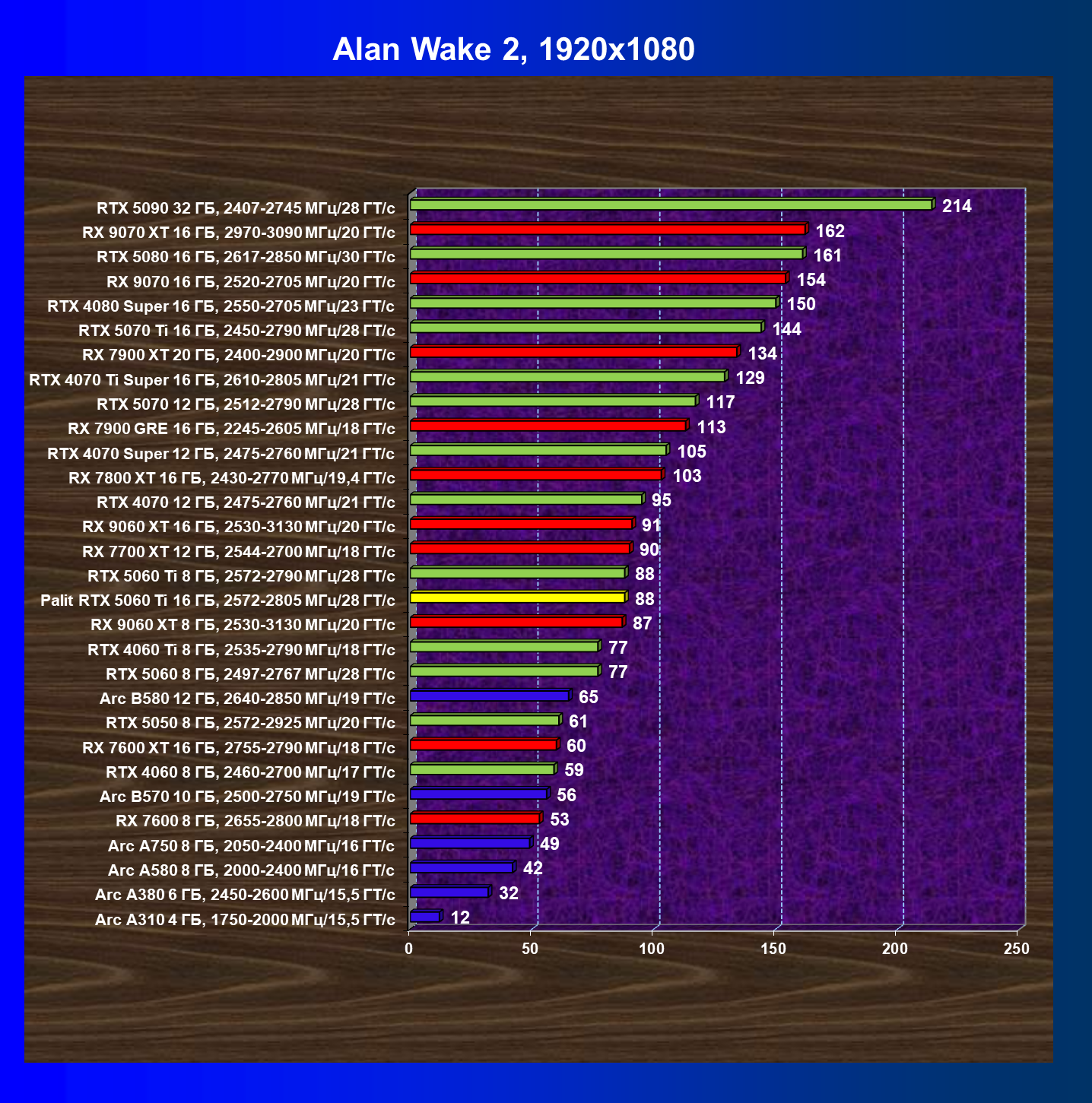 | 13 | Palit RTX 5060 Ti 16 ГБ, 2572—2805 МГц/28 ГТ/с | 273 | 1311 | 48 000 |