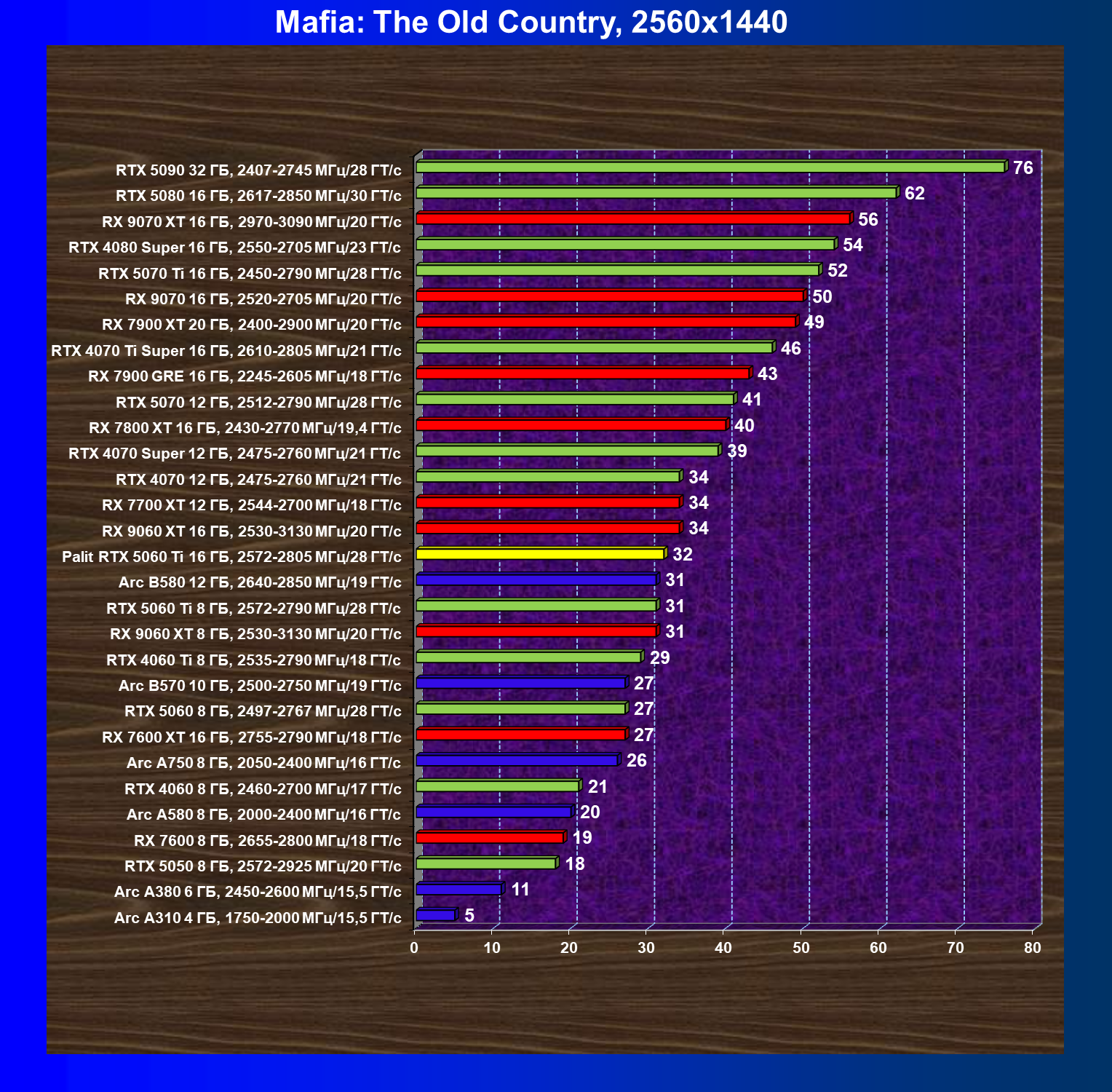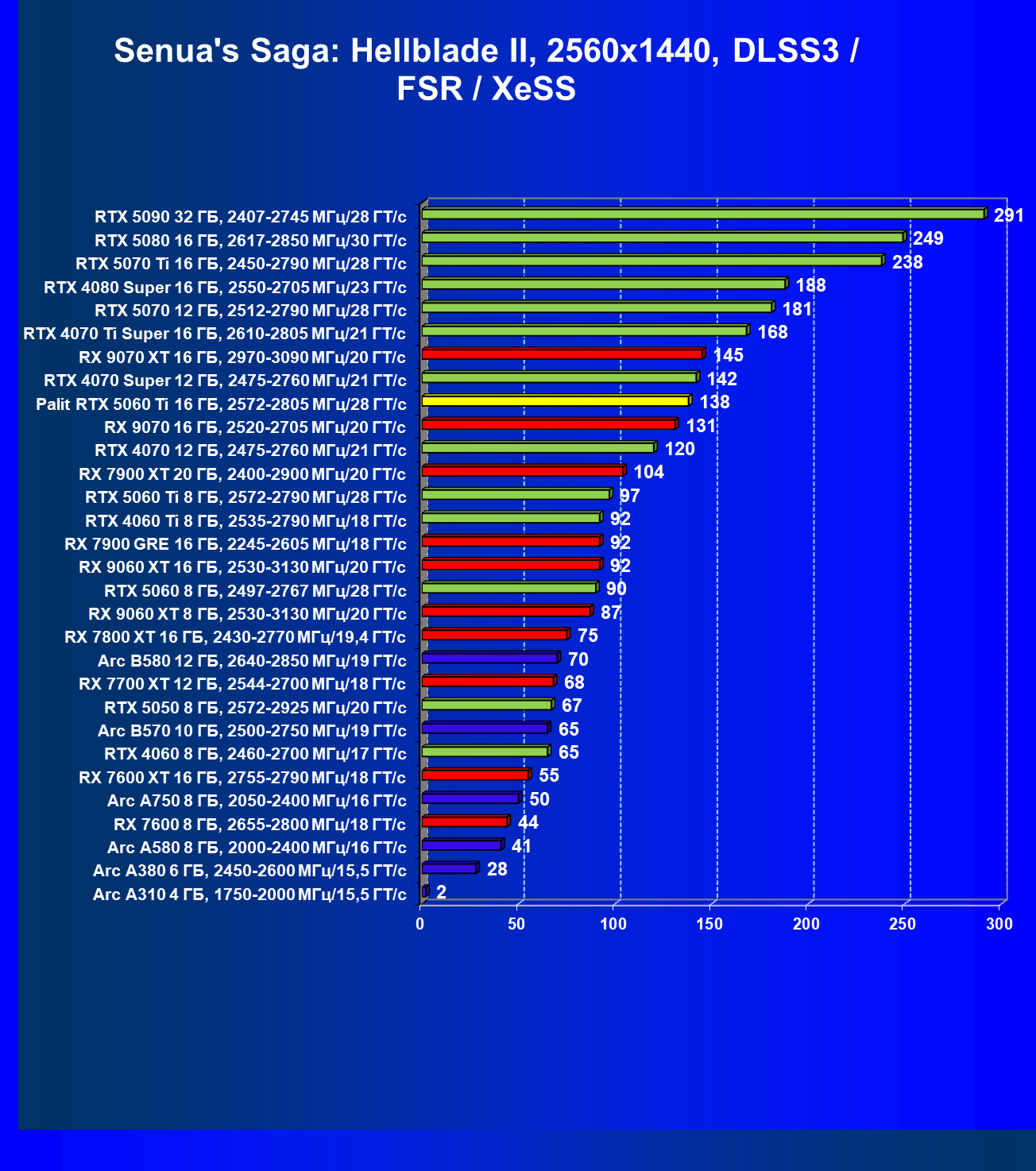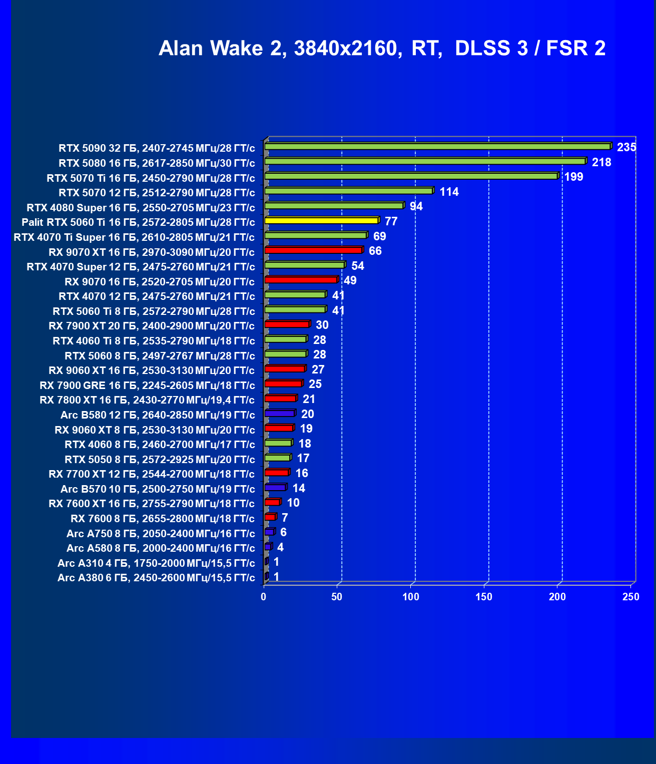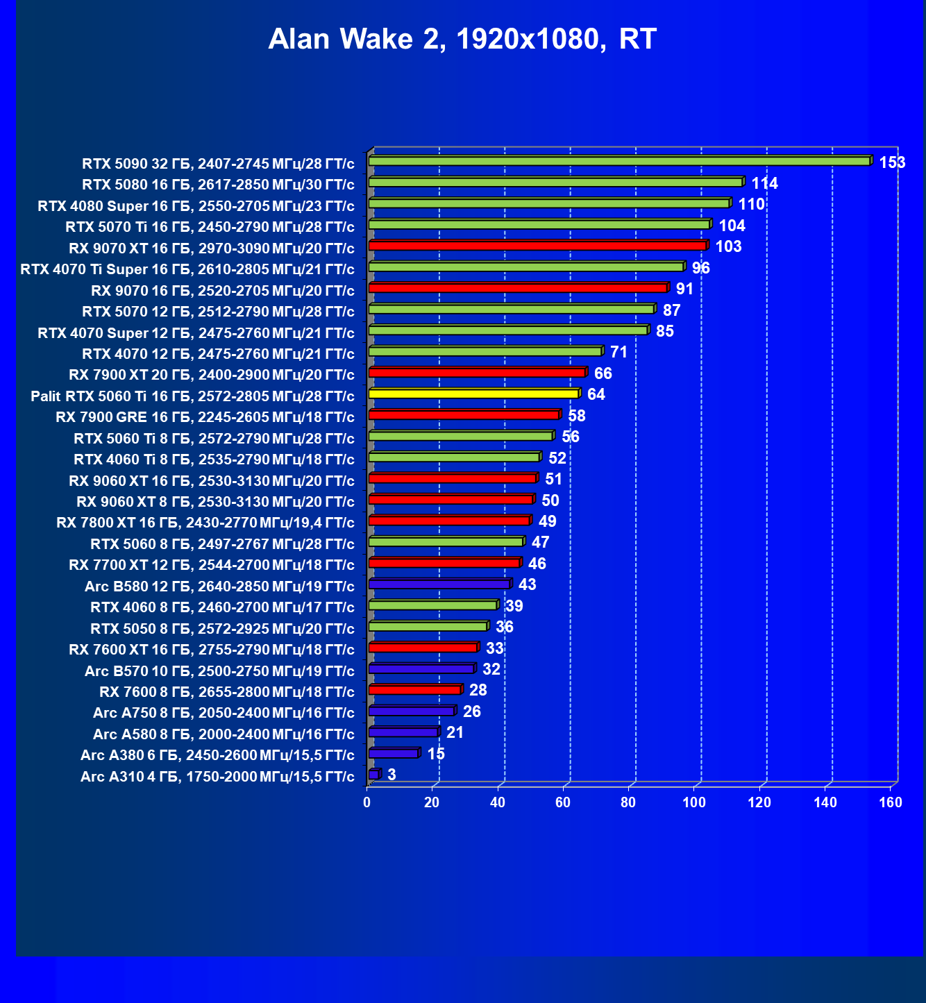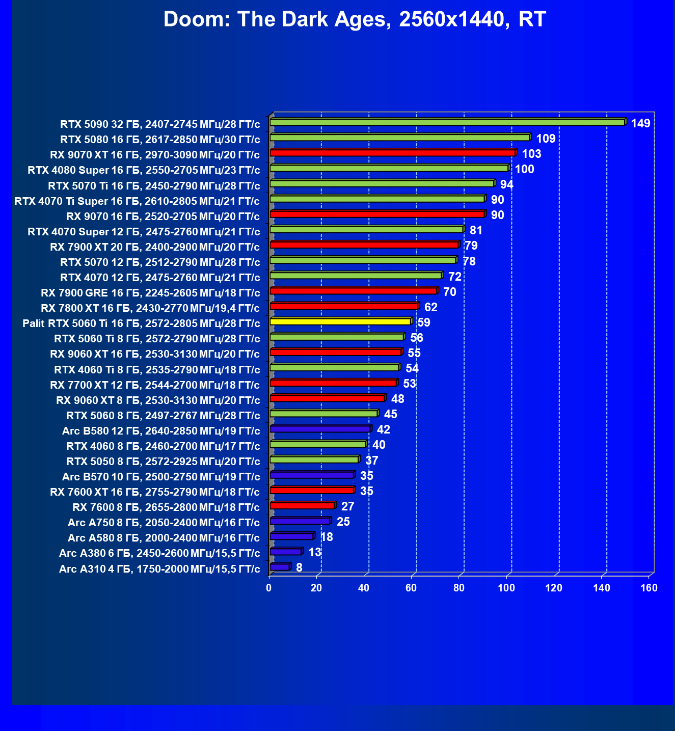 | 13 | Palit RTX 5060 Ti 16 ГБ, 2572—2805 МГц/28 ГТ/с | 273 | 1311 | 48 000 |