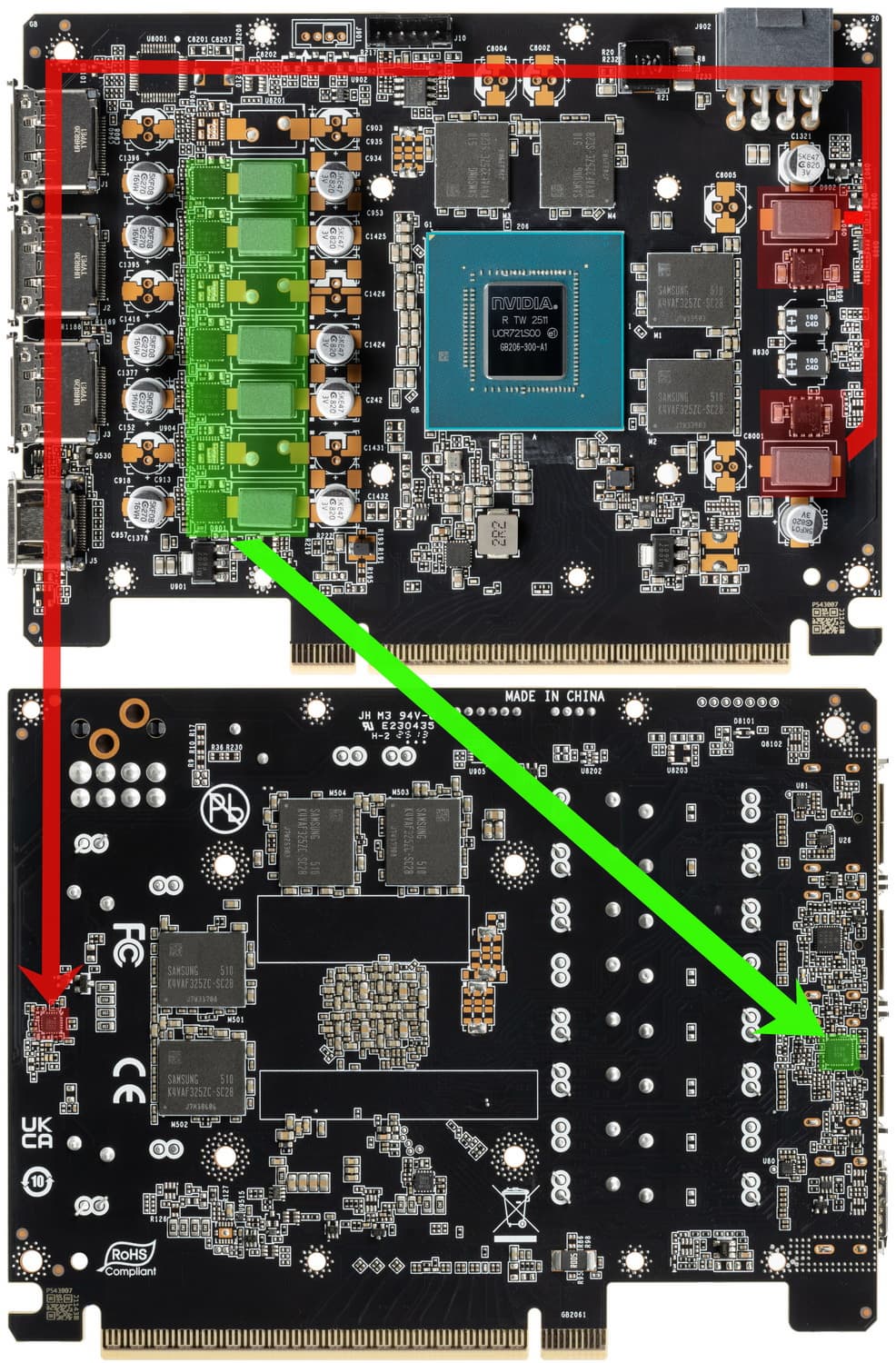 Очевидно, что платы имеют сходства только в плане размещения ядра и микросхем памяти, а по системе питания видны отличия и в количестве фаз, и их размещении.