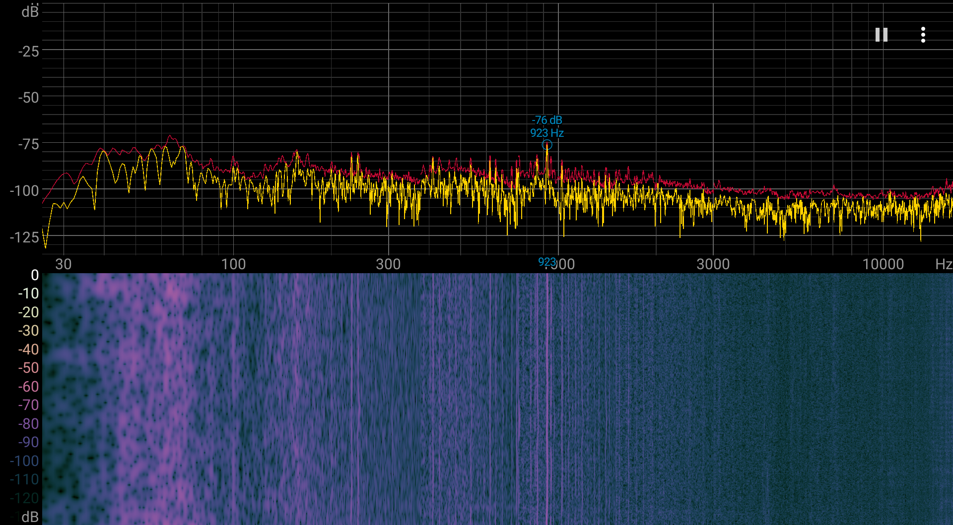 Аудиозапись шума — здесь. Спектрограмма шума — ниже (некоторые заметные призвуки в районе 1 кГц есть).