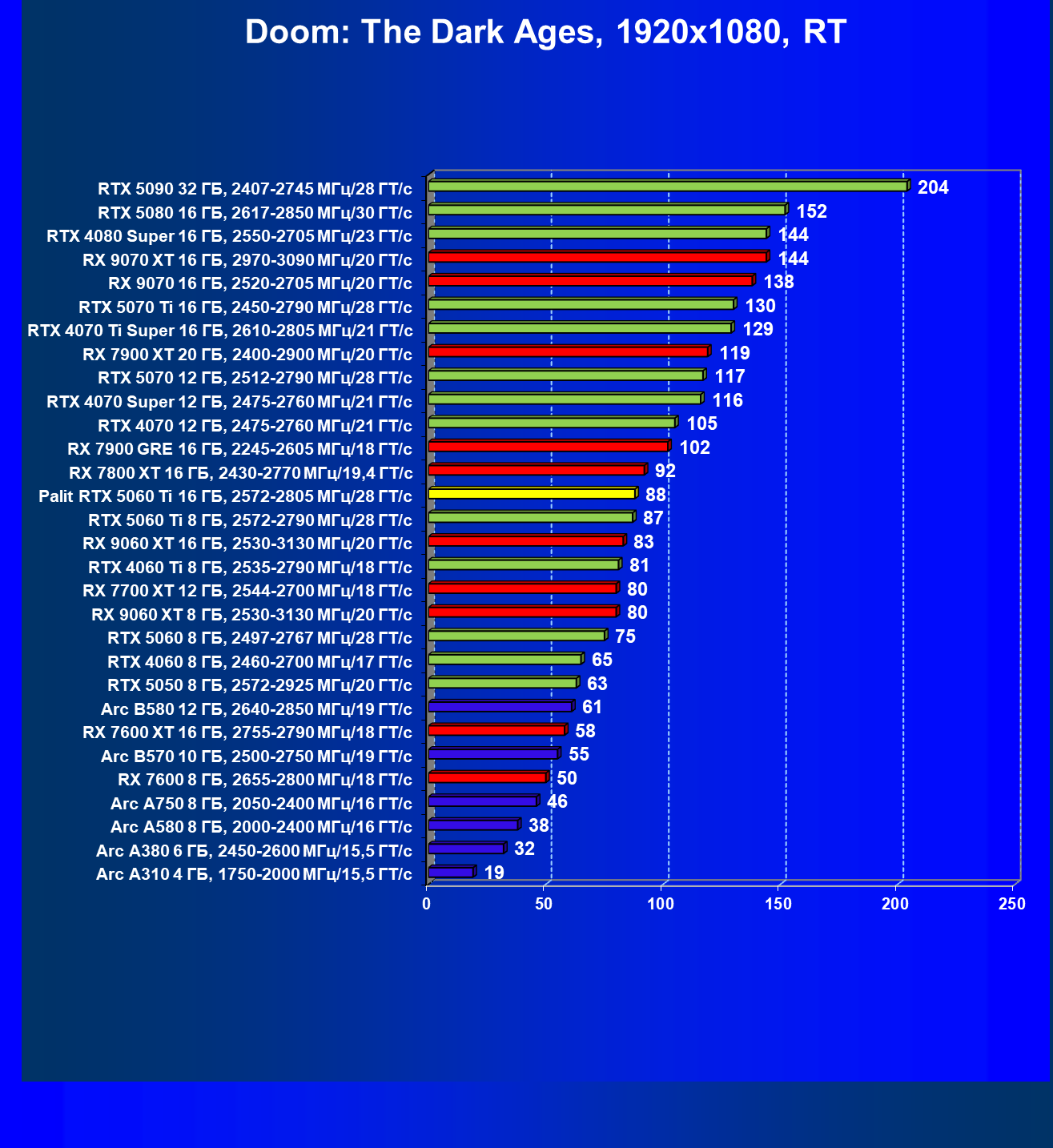 | 10 | RX 9060 XT 16 ГБ, 2530—3130 МГц/20 ГТ/с | 297 | 1338 | 45 000 |