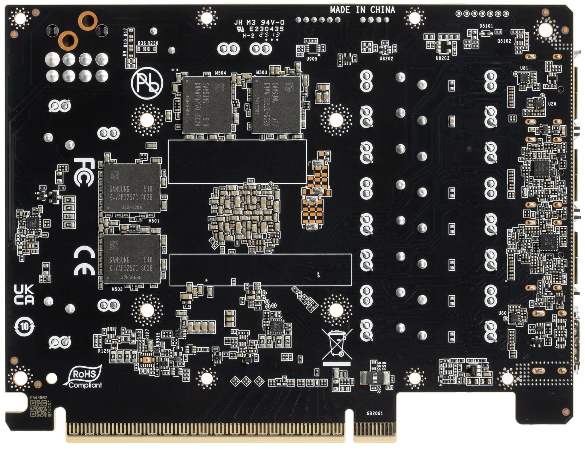 Карта имеет 16 ГБ памяти GDDR7 SDRAM, размещенной в 8 микросхемах по 16 Гбит (по 4 на каждой стороне PCB). Микросхемы памяти Samsung (K4VAF325ZC-SC28) рассчитаны на номинальную частоту работы 2333 МГц (эффективная ПСП 28 Гбит/с или 28 ГТ/с).