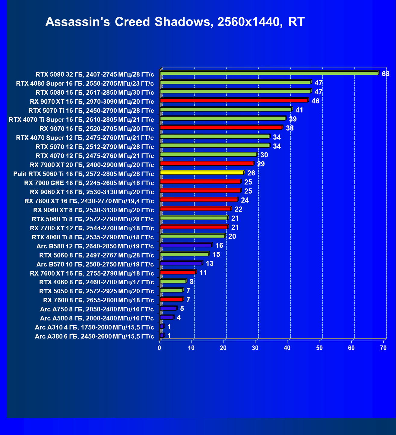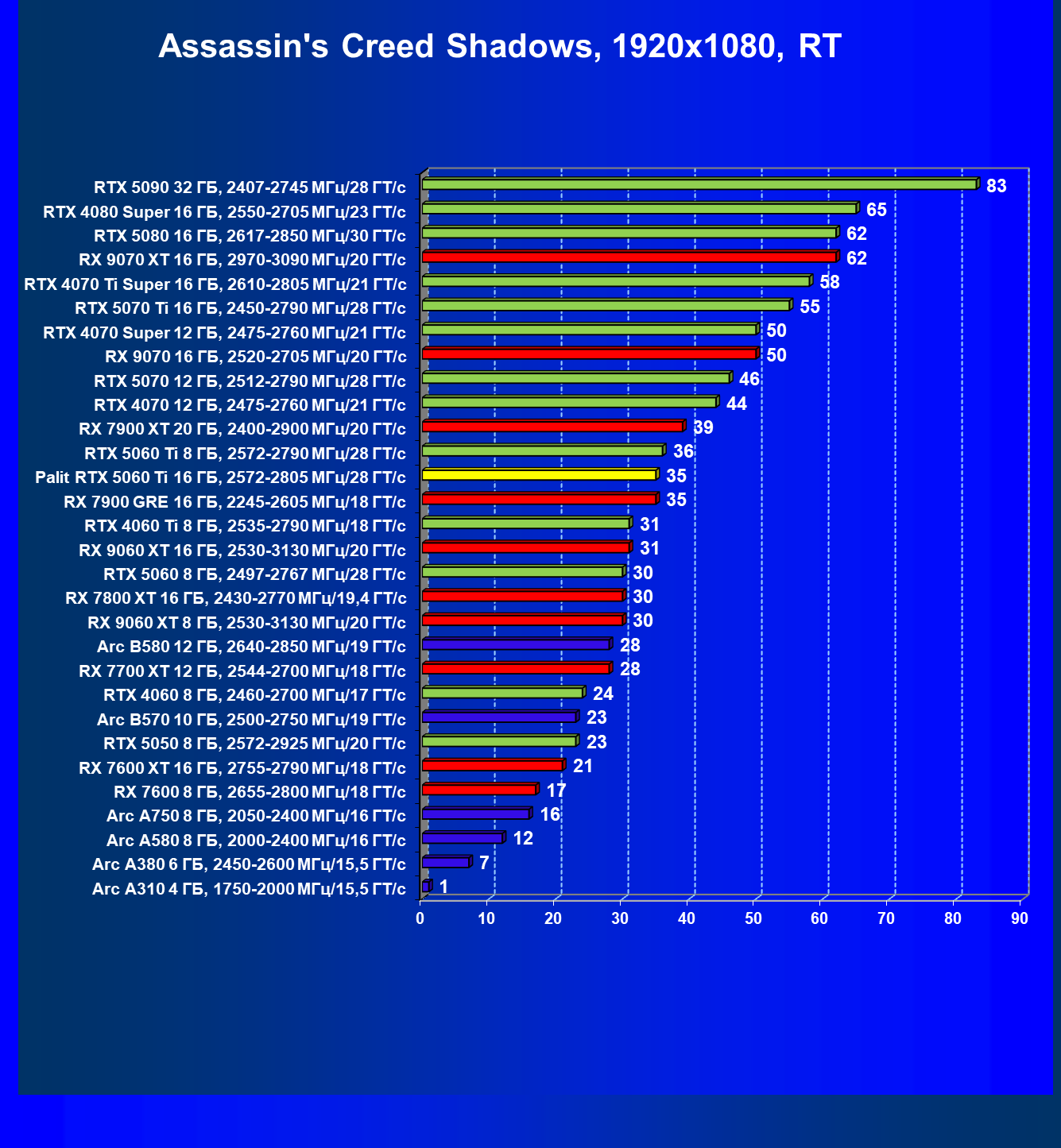 | 14 | RX 9060 XT 16 ГБ, 2530—3130 МГц/20 ГТ/с | 1338 | 297 | 45 000 |