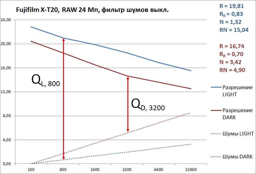Вот такую картину мы получили, сравнивая тестовые снимки RAW с выключенным фильтром шумов: все-таки по разрешению Fujifilm X-T20 заметно уступает флагману. В светлой сцене разрыв относительно невелик — чуть больше 0,5 различимых мегапикселей, но в темной сцене Fujifilm X-T20 проигрывает более 1 различимого мегапикселя. Само по себе это беда небольшая, но если исходить из того, что матрицы у камер одинаковые, то флагман реализует возможности матрицы X-Trans CMOS III лучше.