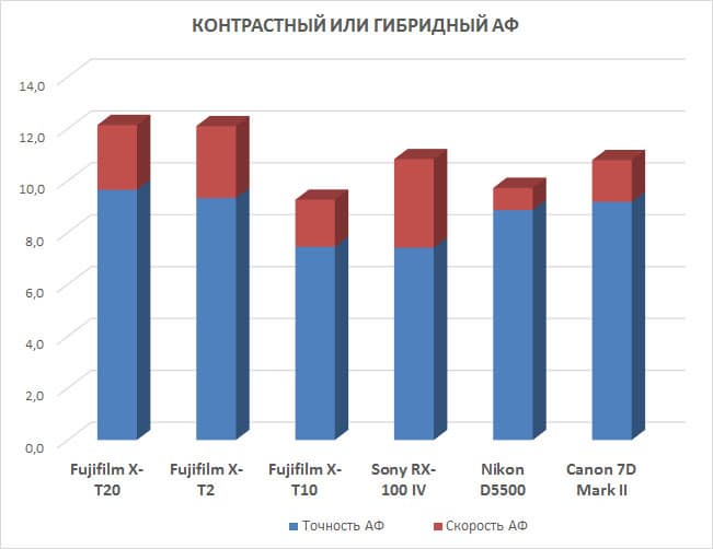 | Контрастный или гибридный АФ | Fujifilm X-T20 | Fujifilm X-T2 | Fujifilm X-Pro2 | Sony RX-100 IV | Nikon D5500 | Canon EOS 7D Mark II |