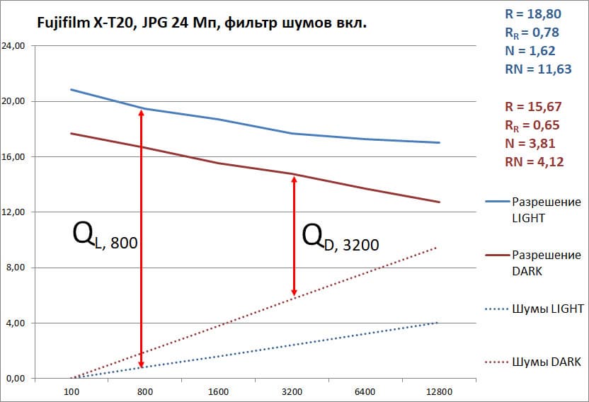 Идем дальше, к сравнению работы Fujifilm X-T20 и X-T2 по тестовым снимкам в JPEG со включенным фильтром шумов. Здесь разрыв по разрешению в светлой сцене — порядка 1,5 различимых мегапикселей, а в темной — чуть меньше 2 Мп. Разница тоже ощутима и хорошо демонстрирует, что качество «шумодава» у флагмана выше (меньшее количество пикселей на матрице становятся неразличимыми). Так, по идее, и должно быть.
