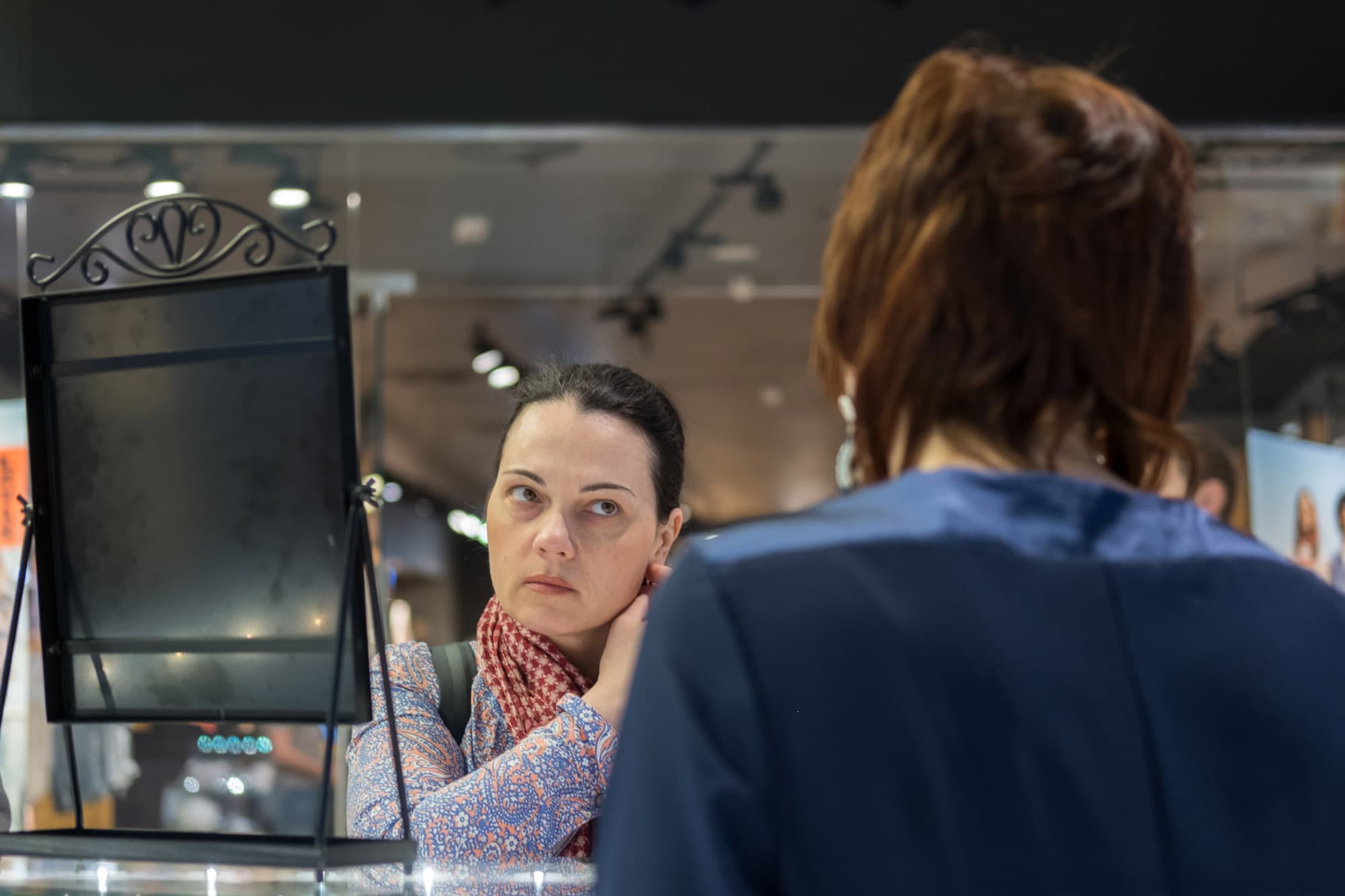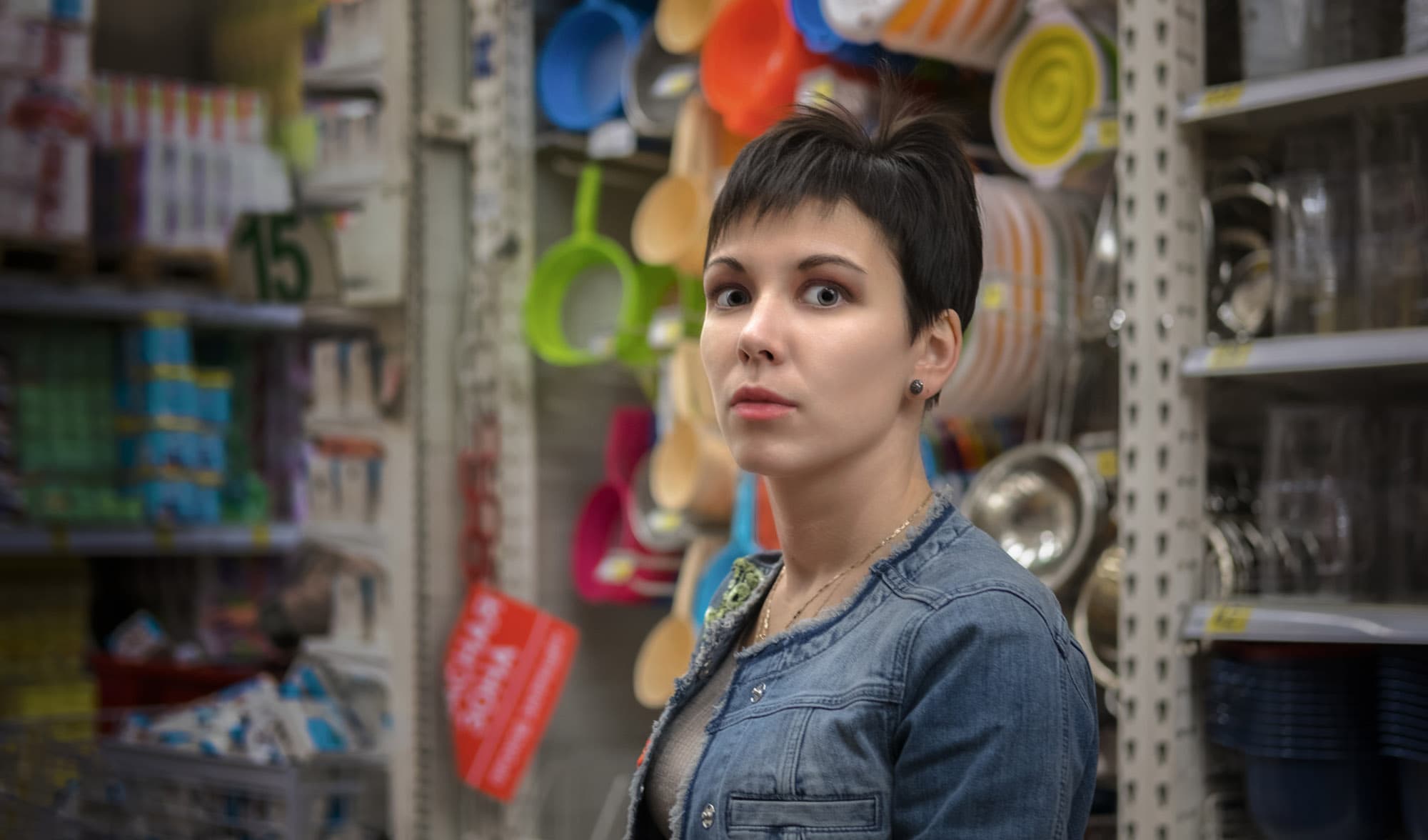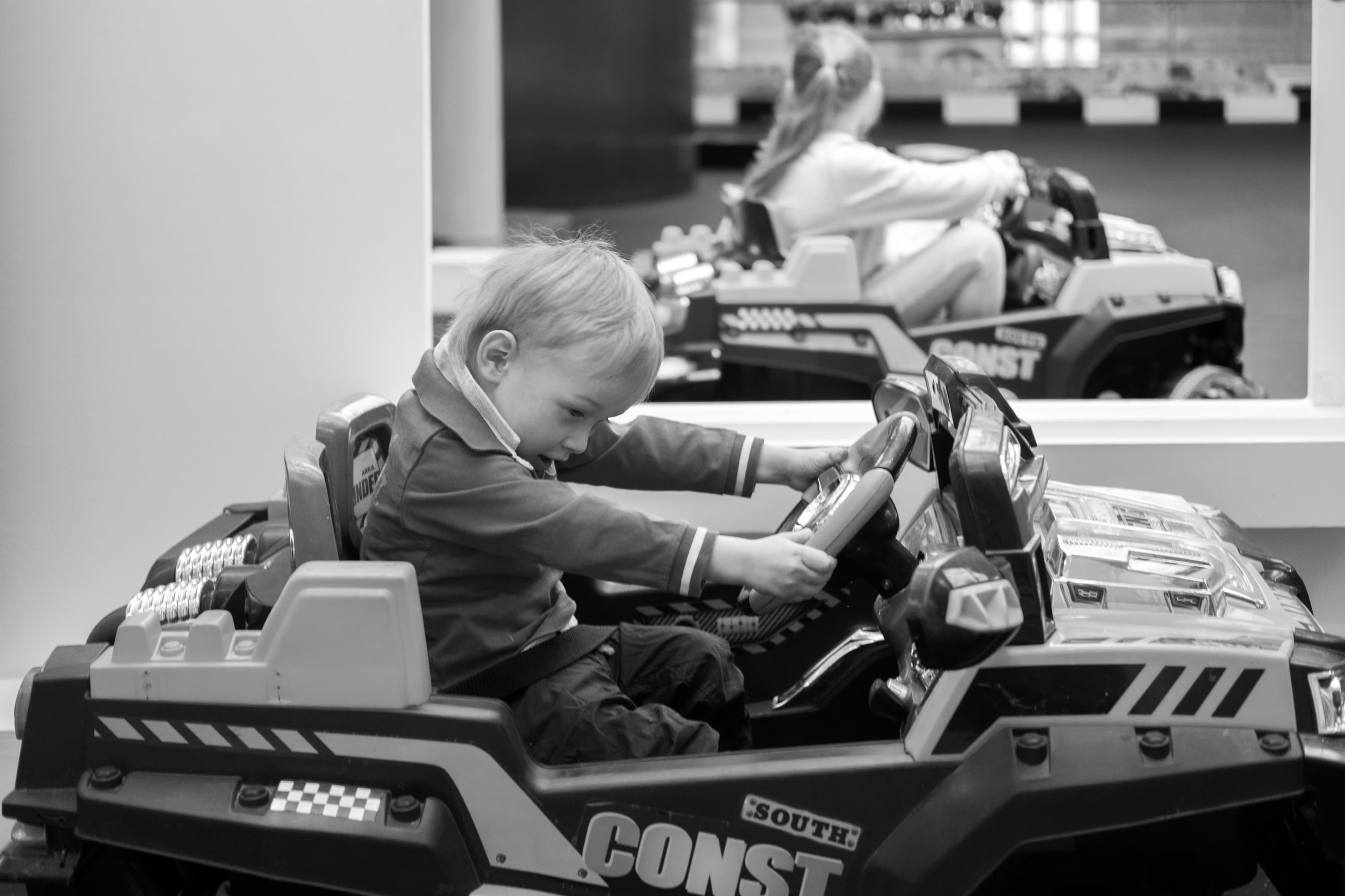 Камера отлично воспроизвела тончайшие нюансы полутонов, причем узкая зона резкости только подчеркивает это. Горизонтальные полосы, заметные в этой области на металлической поверхности трубы-поручня, являются, на деле, отражением витрин, расположенных напротив, и их содержимого.