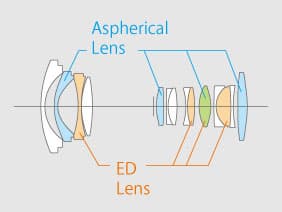Модель выпущена в конце 2013 г., однако ее нельзя считать не только устаревшей, но даже нуждающейся в поспешной реновации, тем более что оптически и технологически она весьма совершенна. Оптическая схема включает 14 элементов (это довольно много), причем среди них целых четыре асферических стекла и четыре линзы со сверхнизкой дисперсией.