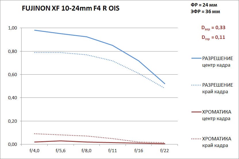 Разрешение в диапазоне f/4—f/16 в центре кадра — высокое и очень высокое (снижается от 0,95 линии на пиксель до 0,7 линии), но на закрытой диафрагме падает до 0,5 линии. Разрешение на краю кадра заметно отстает от разрешения в центре, но все равно остается высоким в диапазоне f/4—f/16. Хроматические аберрации заметны только на краю кадра на широкой диафрагме, а начиная с f/11 становятся почти незаметны. В центре кадра «хроматика» почти не видна во всем диапазоне диафрагм.