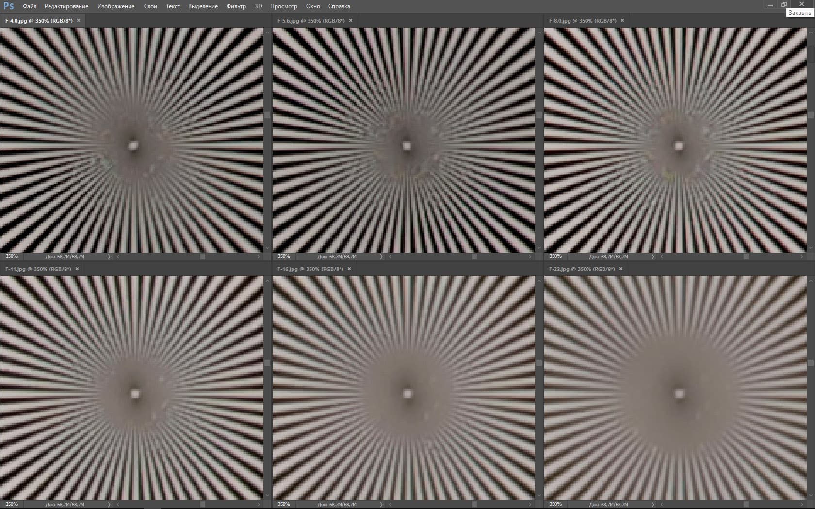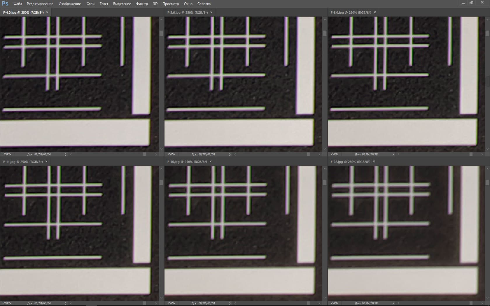 | На всех скриншотах: верхний ряд: f/4,0 — f/5,6 — f/8,0, нижний ряд: f/11 — f/16 — f/22 | |||