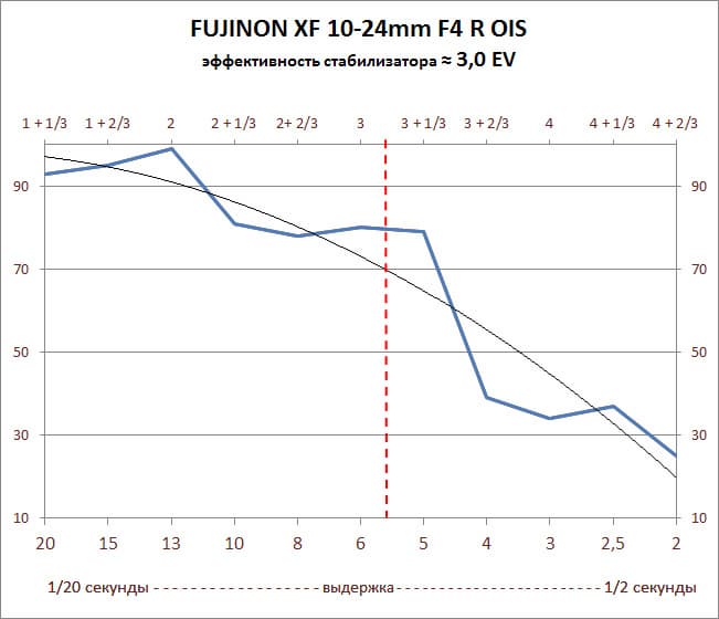 Последняя часть нашей лабораторной работы — определение эффективности стабилизатора. Здесь можно сразу представить график, по которому видно, что оптический стабилизатор может «подарить» нам примерно 3,16 ступени EV.