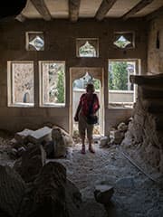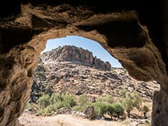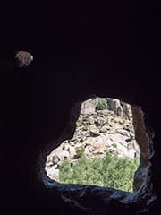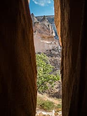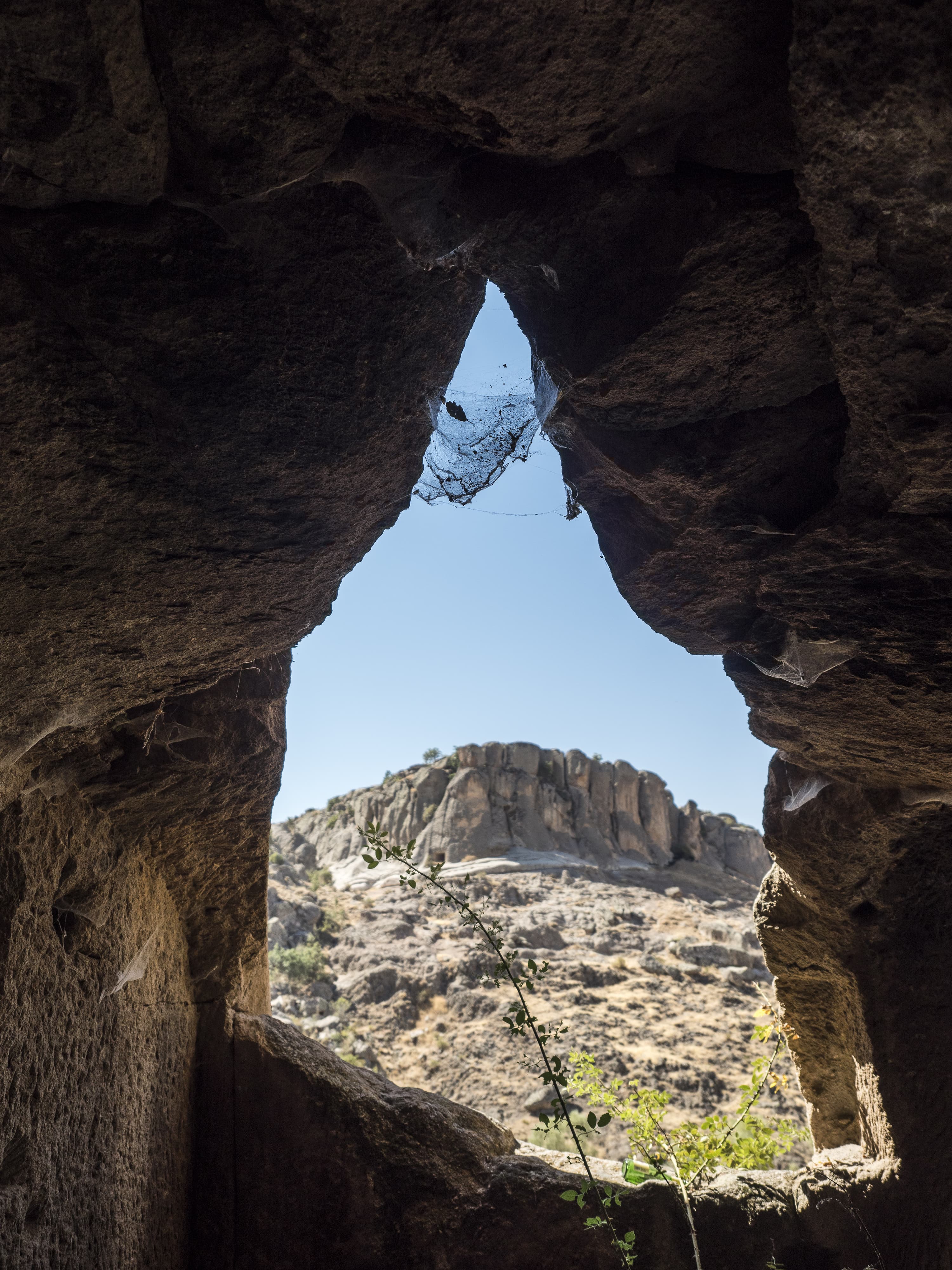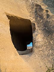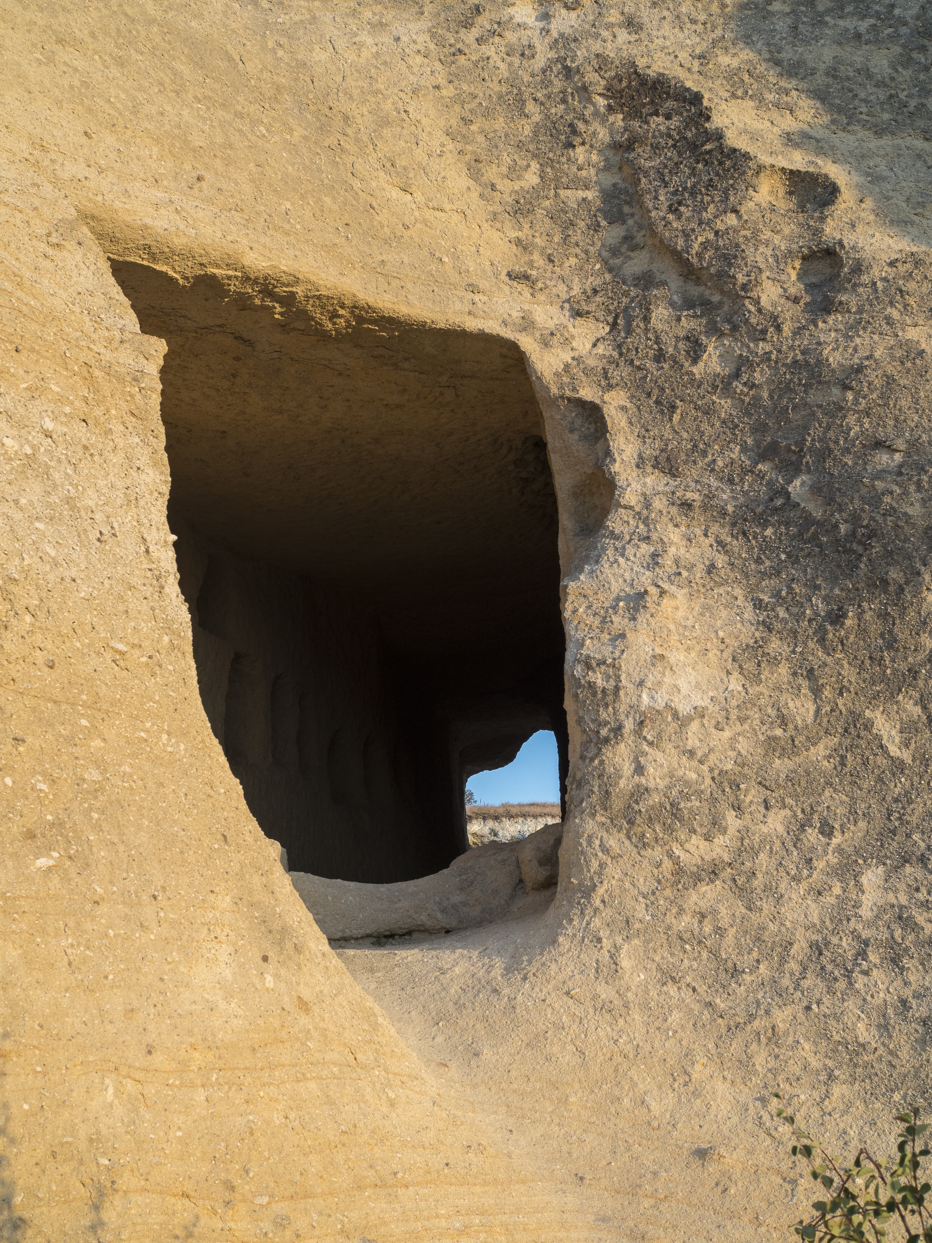 Когда я впервые увидел это место, то почему-то вспомнил Минас-Тирит из Толкиеновской трилогии «Властелин колец». Вход в пещеру-преддверие расположен на высоте около полутора метров над поверхностью земли. В древности, вероятно, пользовались деревянной лестницей, которую убирали для защиты от непрошенных гостей. Теперь тут лежат несколько камней, но влезать внутрь все равно очень нелегко, особенно с рюкзаком.