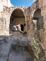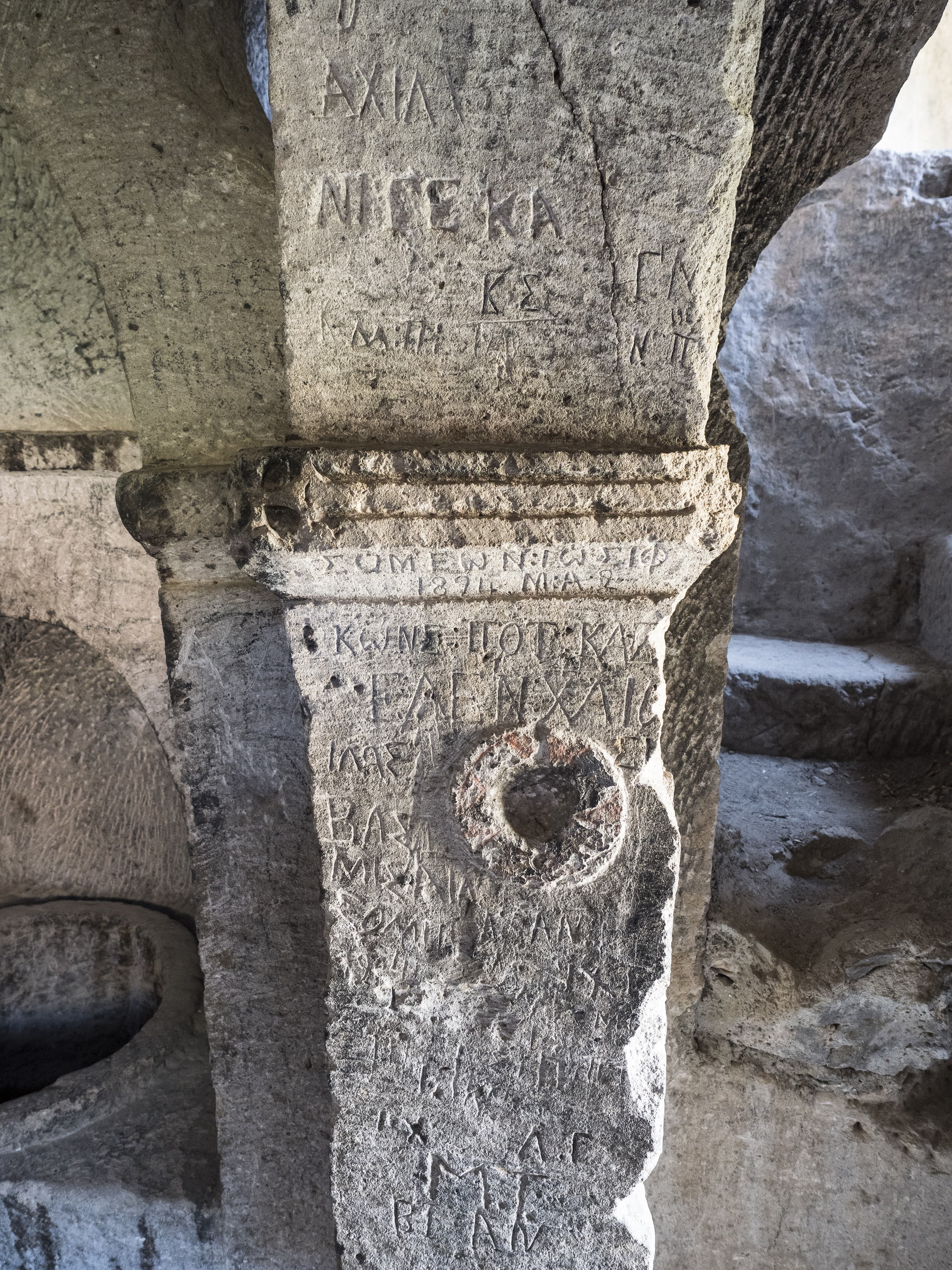 Пещеры церкви (три этажа!) были вырублены в скале в период иконоборчества и не содержат росписей. Однако внутри остались изображения мальтийского креста и более поздние надписи на греческом XIX века. Ме́ста во всех помещениях очень мало, едва хватает на то, чтобы развернуться.