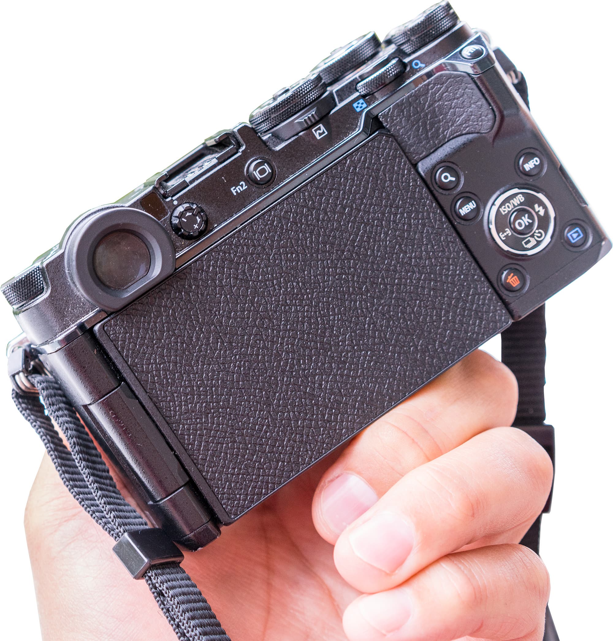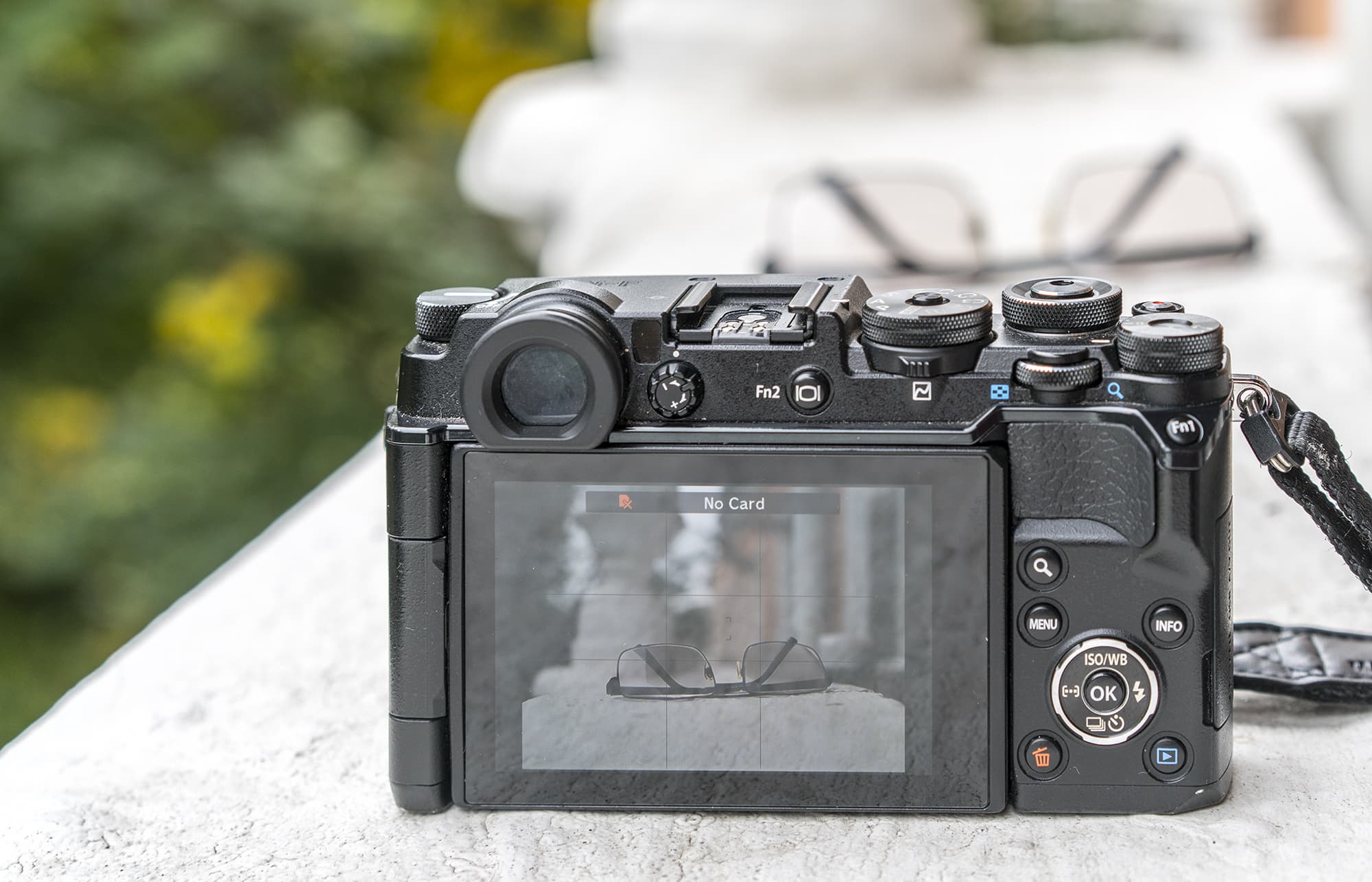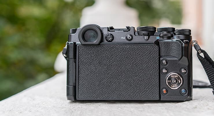 Сзади расположены: дисплей, окуляр оптоэлектронного видоискателя, колесико его диоптрийной коррекции, функциональные кнопки 1 и 2 (Fn1, Fn2), колесо управления выбором параметров, профилированный упор для большого пальца правой руки, кнопки увеличения изображения, меню, информации, стирания, воспроизведения и пятипозиционный джойстик.