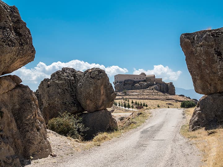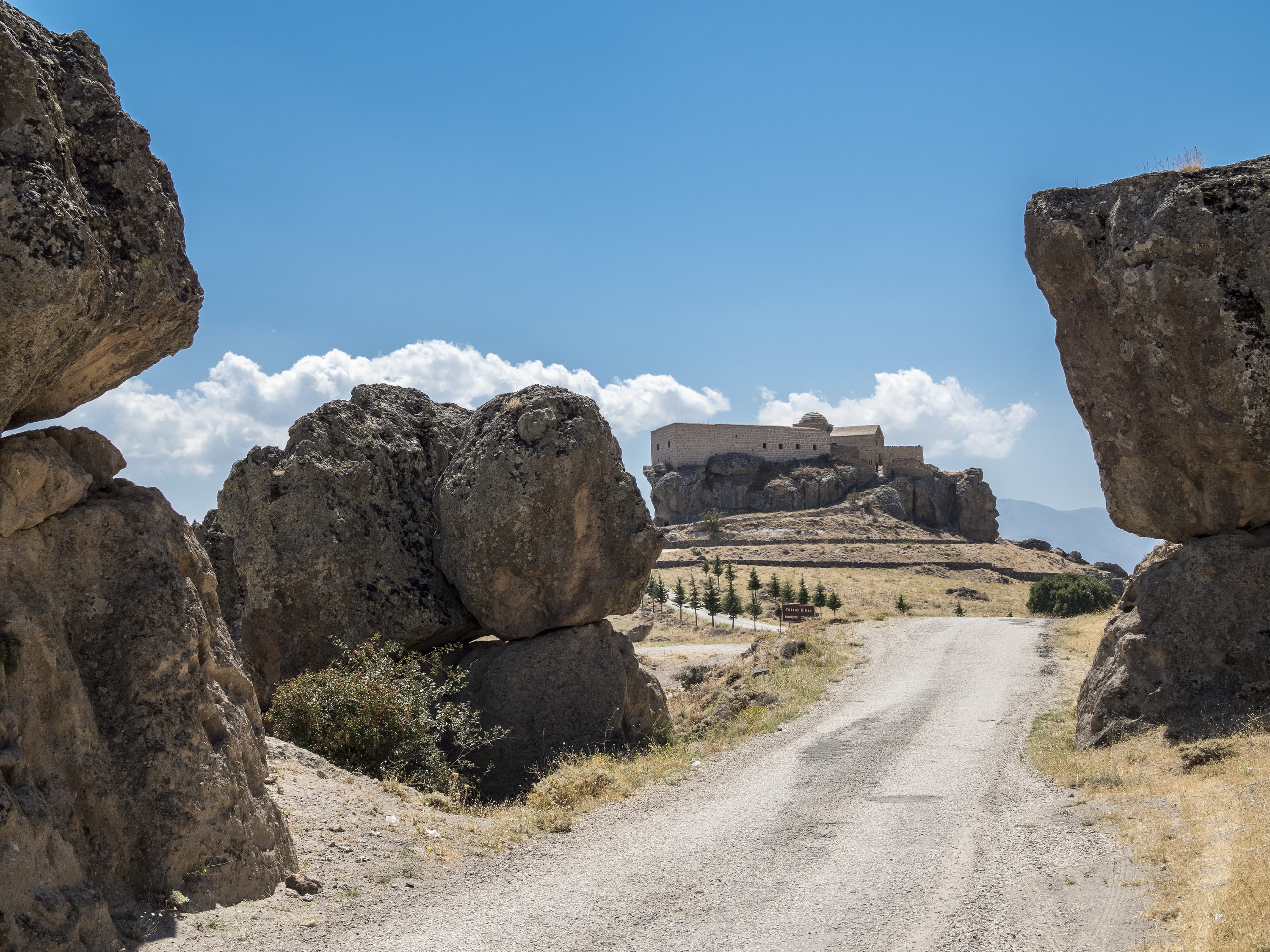 К монастырю Вознесения ведет горная дорога, вдоль которой тут и там стоят вот такие каменные гиганты. Это не причуда природы, а деяние человеческих рук: камни стоят, сложенные по два.