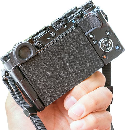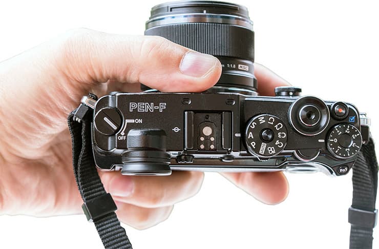 Мне непонятно, какими мотивами руководствовались разработчики камеры; во всяком случае, похоже, что удобство обращения с аппаратом у них явно отходило на второй план. Olympus PEN-F — камера весьма скромная по размерам, но на ней нет никакой ручки и даже утолщения для удержания в правой руке. Кое-что должен был бы предложить упор для большого пальца, но с ним у меня тоже возникали сложности. Во-первых, он расположен слишком низко, и для управления колесом экспокоррекции палец приходится смещать с упора вверх. Во-вторых, не только мизинец, но и безымянный палец моей правой руки не могут охватить аппарат и свешиваются вниз: им просто некуда деться.