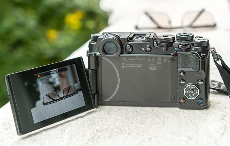 В традиционном, рабочем положении дисплей достаточно ярок даже на дневном свету и позволяет визировать без особых осложнений. Однако при съемке на открытом солнце он, разумеется, «слепнет», и тогда не остается иного выхода, кроме как приложить все-таки глаз к видоискателю (чего так не любят делать некоторые современные фотолюбители).