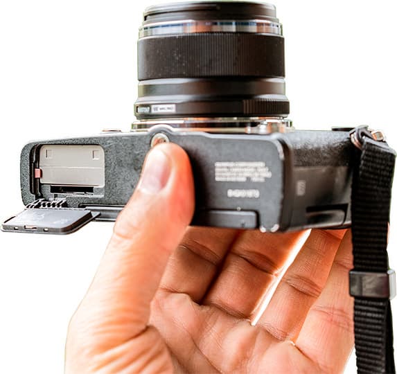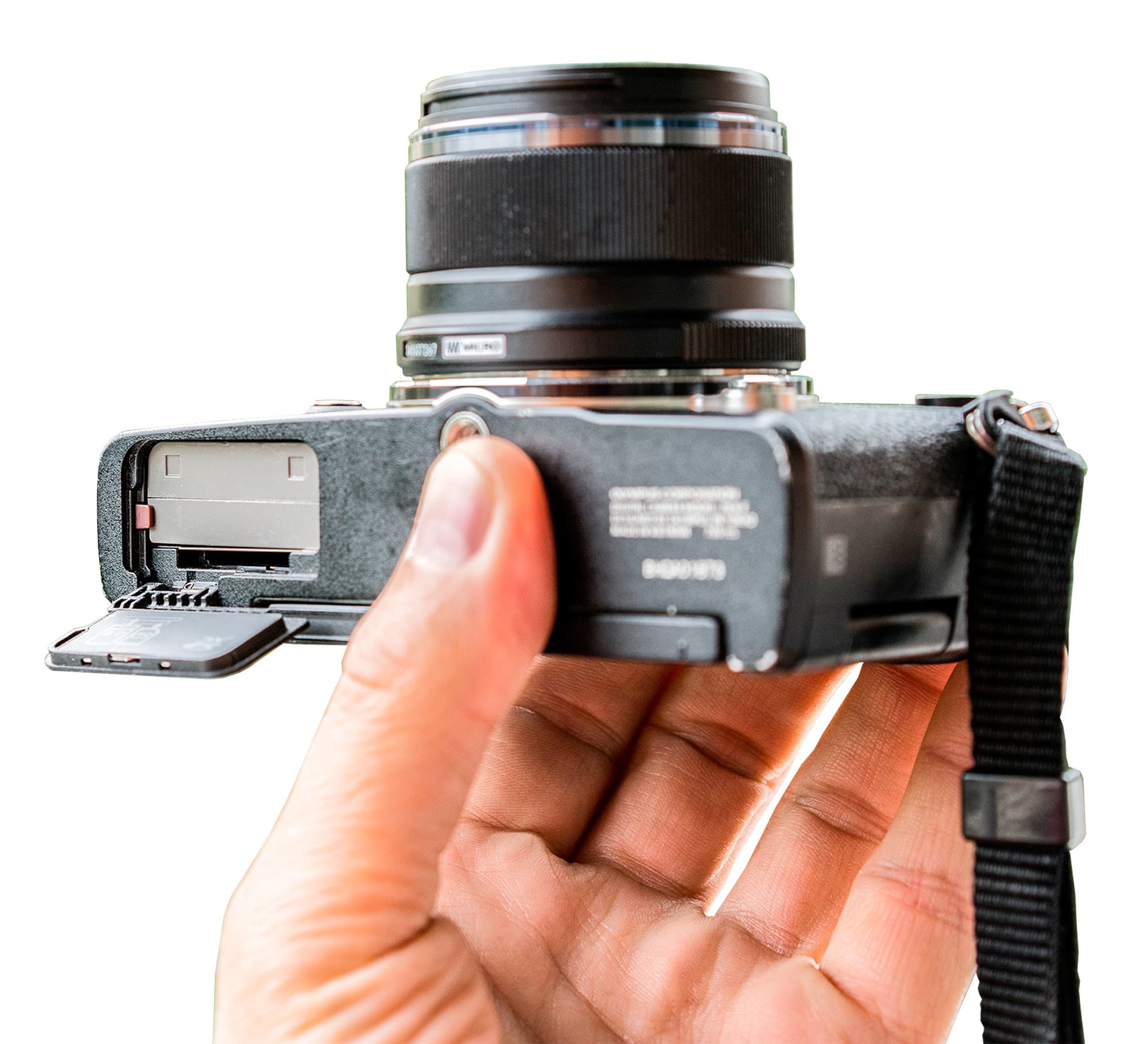 На нижней панели камеры расположены отсек для батареи и слот для карты памяти, причем они соседствуют под одной крышкой. В центре, ближе к переднему краю, имеется стандартная резьба 1/4″ для крепления камеры на штативе.