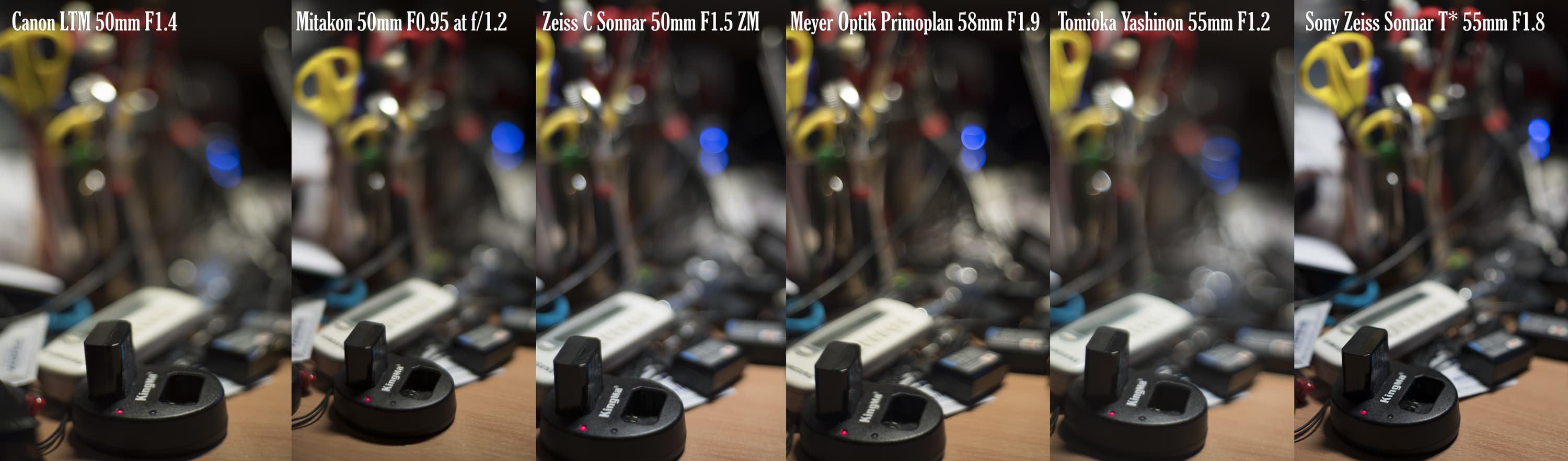 Некоторое время назад я провел экспресс-исследование качества бокэ среди некоторых своих объективов с фокусным расстоянием 50 мм и чуть больше. Участвовали: Canon 50mm F1.4 LTM (Leica Thread Mount), Zhongyi Mitakon Speedmaster Pro 50mm F0.95, Carl Zeiss C Sonnar 50mm F1.5 ZM (для Leica-M), Meyer-Optik Gorlitz Primoplan 58mm F1.9, Tomioka Yashinon 55mm F1.2 и Sony Zeiss Sonnar T* 55mm F1.8 — наш сегодняшний подопечный. Освещение — один газоразрядный источник с температурой около 6500 K. Съемка с рук, без штатива. Приоритет диафрагмы (на каждом объективе установлена F2), фокусировка по букве «i» надписи KingMa на батарейном заряднике.