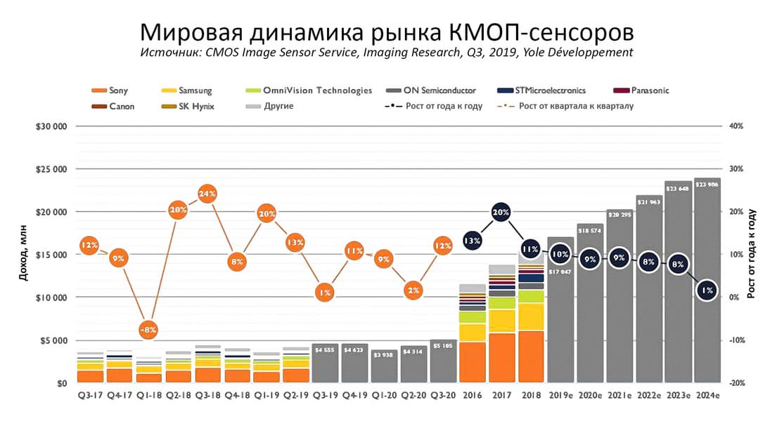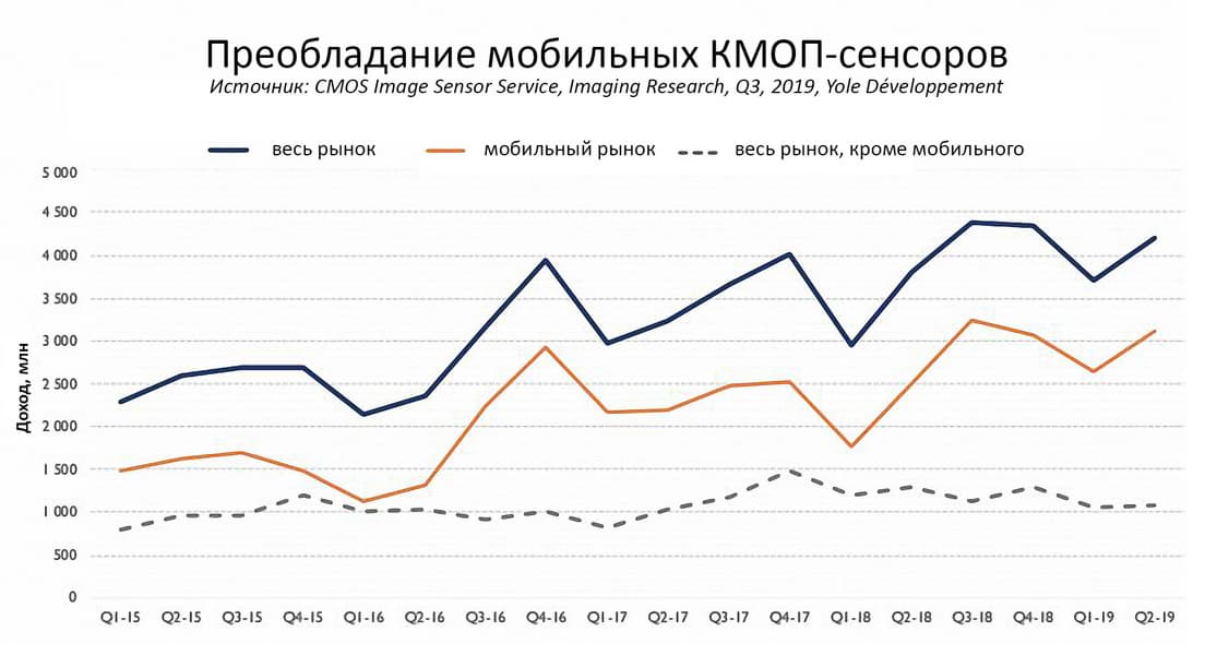 Что касается мобильного сегмента рынка сенсоров как такового, то он растет не за счет расширения производства смартфонов, а за счет увеличения количества камер в каждом из них — как основных (тыльных), так и фронтальных.