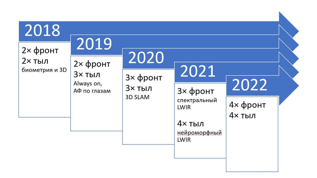 Многокамерность питается не столько фото- и видеографическими потребностями карманных устройств, сколько расширением их функциональности. Если в 2018 г. ее движителями являлись сбор биометрических данных и 3D-приложения, то в настоящем году к ним добавились автофокусировка по глазам и идентификация пользователя в режиме «всегда включен» (always on), а в ближайшем будущем добавятся трехмерное позиционирование и картирование (3D SLAM, Simultaneous Location And Mapping) и детекция лиц в низкочастотном инфракрасном диапазоне (LWIR, Low-Wave Infra Red).