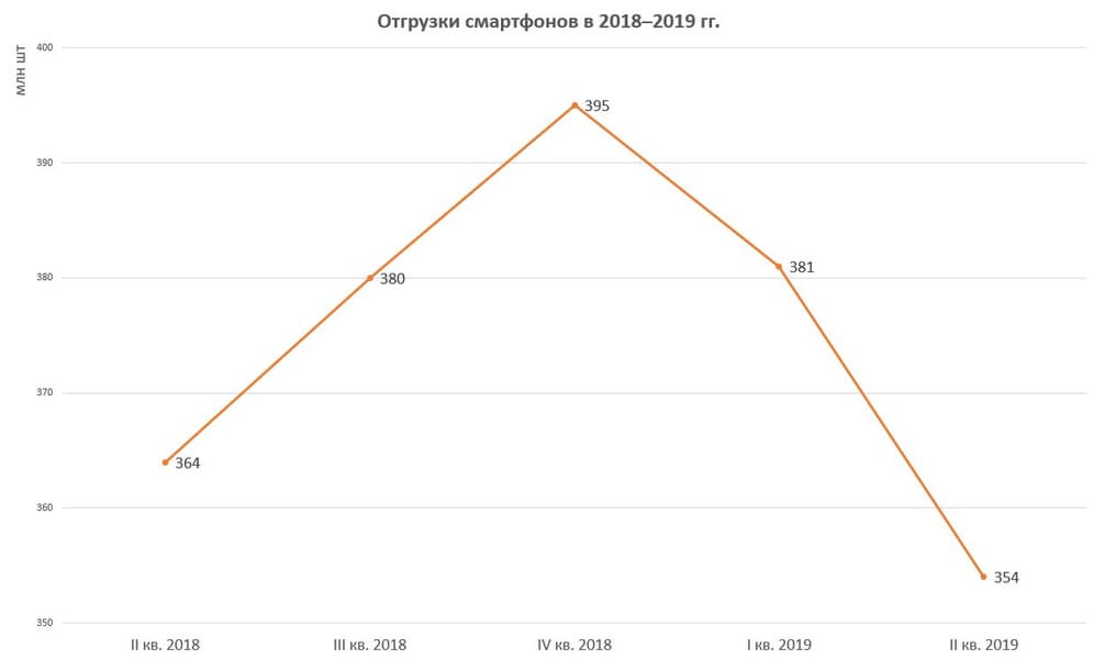 Во II кв. 2019 г. в мире отгружено на 10 млн смартфонов меньше, чем за аналогичный период 2018 г. В абсолютных цифрах разница большая, но относительно уровня, достигнутого на конец 2018 г., составляет лишь около 10%, то есть находится в пределах погрешности, определяемой сезонной вариабельностью спроса. Интересно, что покажет 2019 год в целом с учетом рождественских и новогодних распродаж.