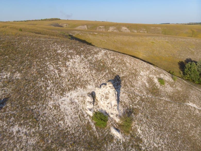 После выделения объекта аппарат совершает его круговой облет, постепенно удаляясь. Урывский меловой каньон. Село Селявное. Воронежская обл. UHD 4K (3840×2160 30p).