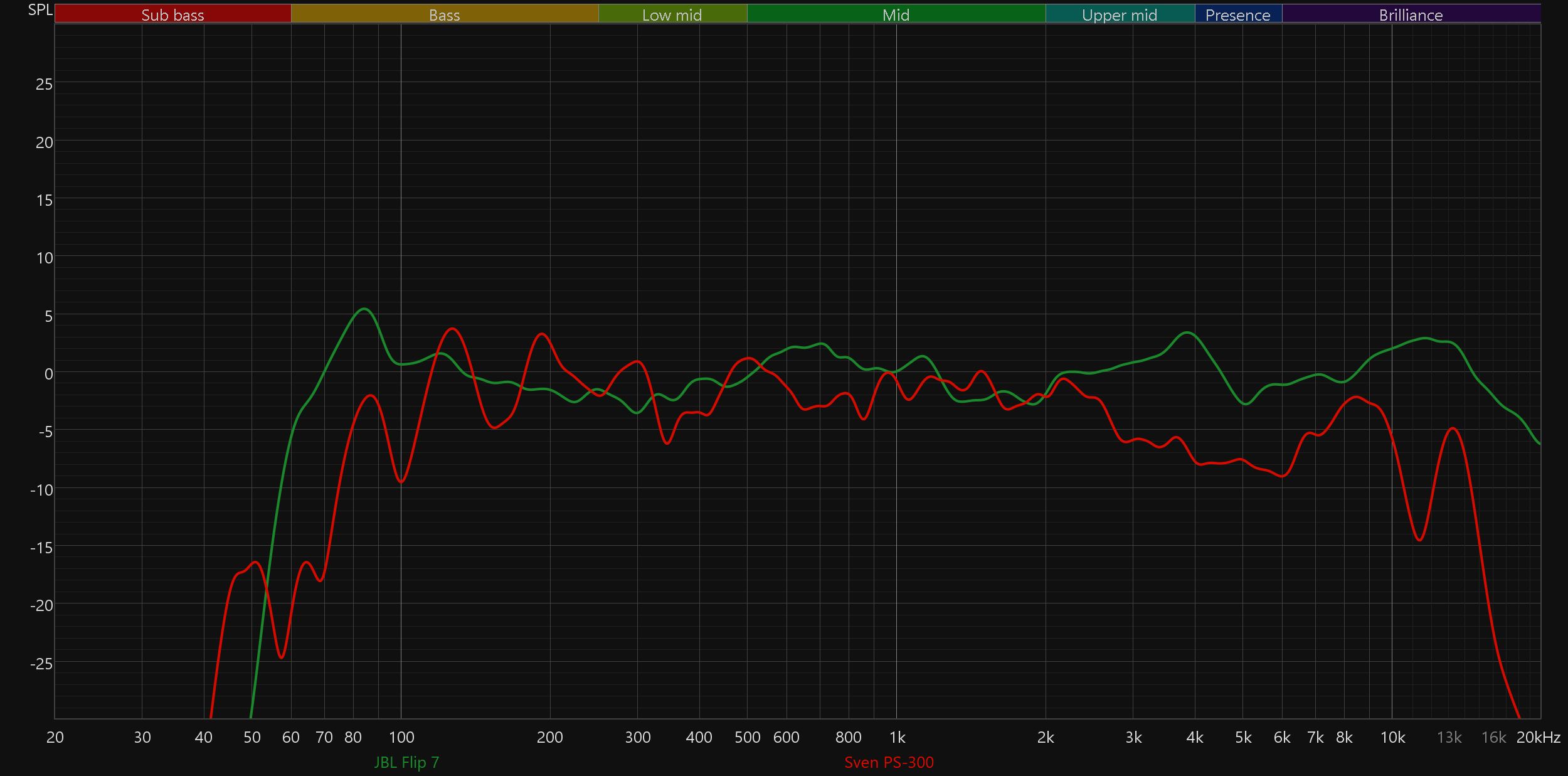 Сравним графики АЧХ новой JBL Flip 7 и прошлой Flip 6 — очевидно, что стало намного лучше: бас получился более объемным и менее гулким, середина подается ровнее и с большим количеством деталей, не стало лишних акцентов в верхних частотах.
