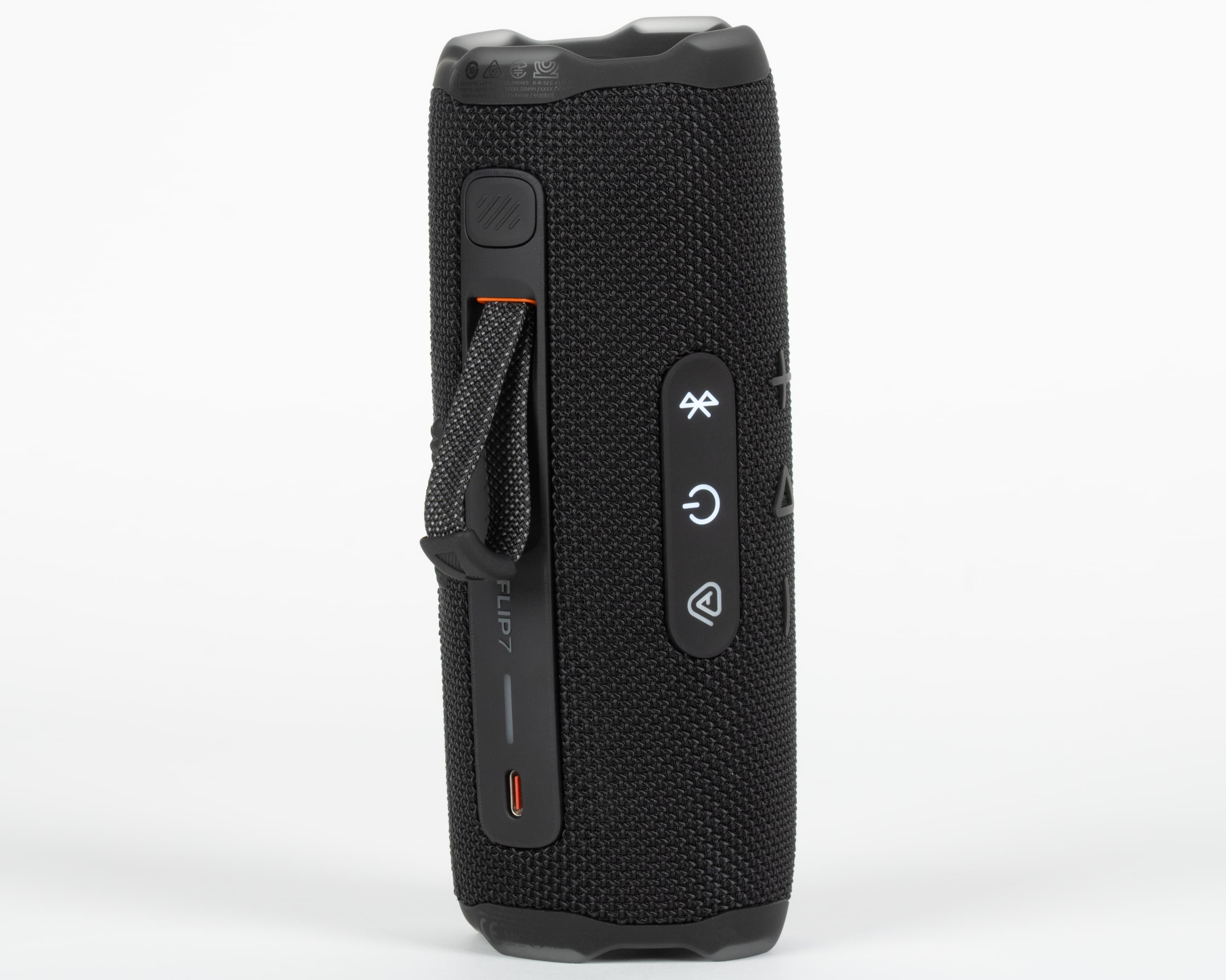 Кнопки управления воспроизведением и громкостью, как и раньше, сделаны рельефными — ими удобно пользоваться на ощупь. В предыдущей модели Flip 6 рядом с ними находилась кнопка активации режима PartyBoost, которую легко было перепутать с клавишей воспроизведения. В Flip 7 клавишу Auracast перенесли на отдельную панель, благодаря чему пользоваться управлением стало заметно удобнее. Сами кнопки нажимаются с комфортным усилием и мягким, но четким кликом.