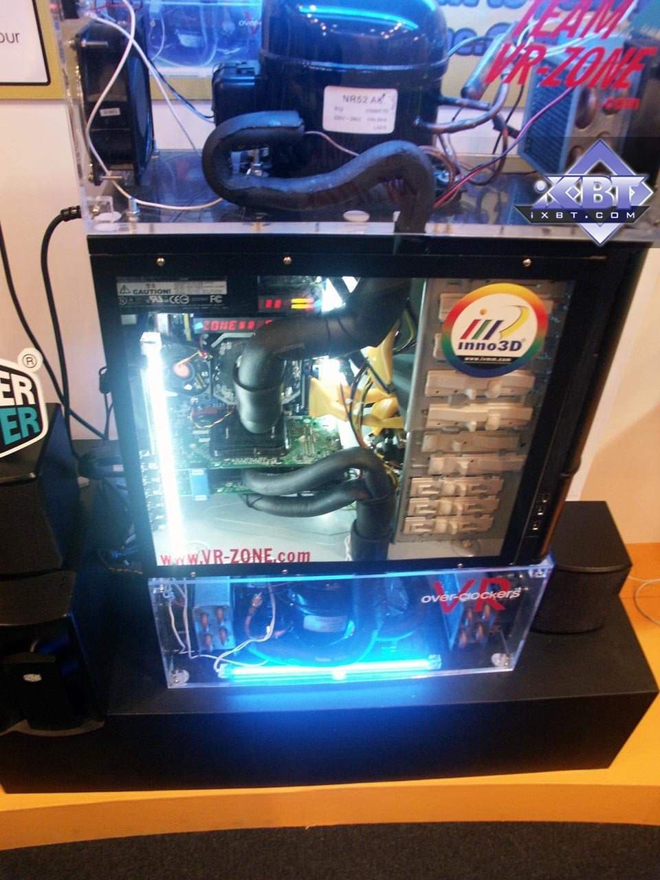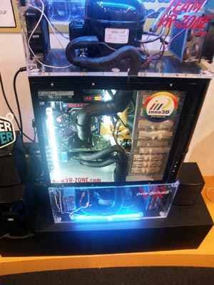 | Фирма почему-то демонстрировала не только свои видеокарты (в которых ничего нового и интересного не было), но и системные блоки с водяным охлаждением от другой компании. Мои попытки узнать — что это за пассаж, не увенчались успехом: на стенде просто не оказалось англоговорящего сотрудника. :( |  |