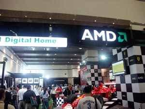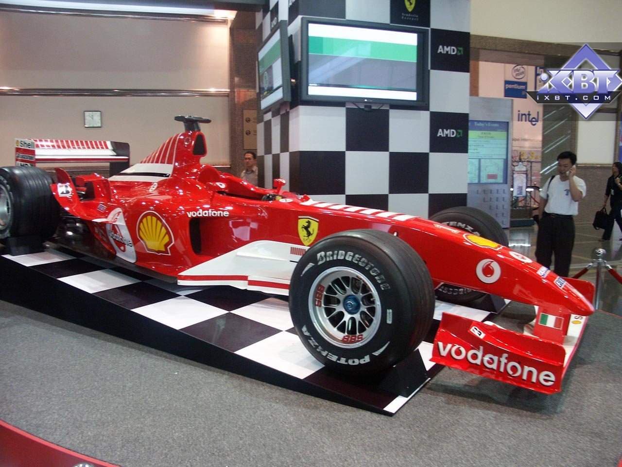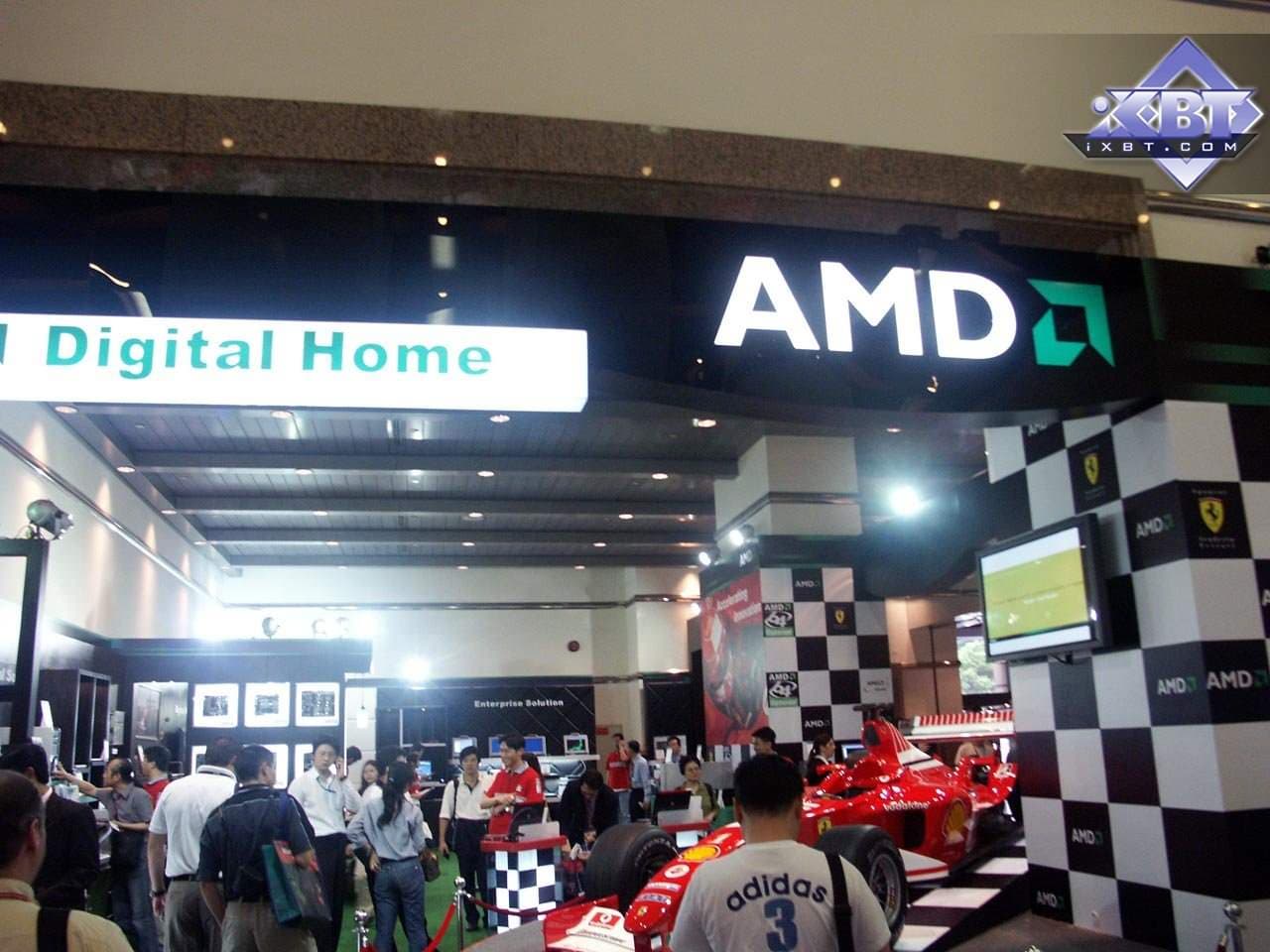 AMD на своем стенде, разумеется, прославляла и расхваливала свое семейство двухядерных процессоров, а также серверные решения на основе Оптеронов. Как мощный маркетинговый инструмент на стенде стоял болид, участвовавший в гонках, где спонсором является AMD.