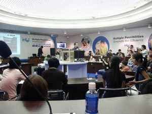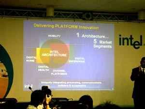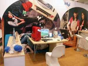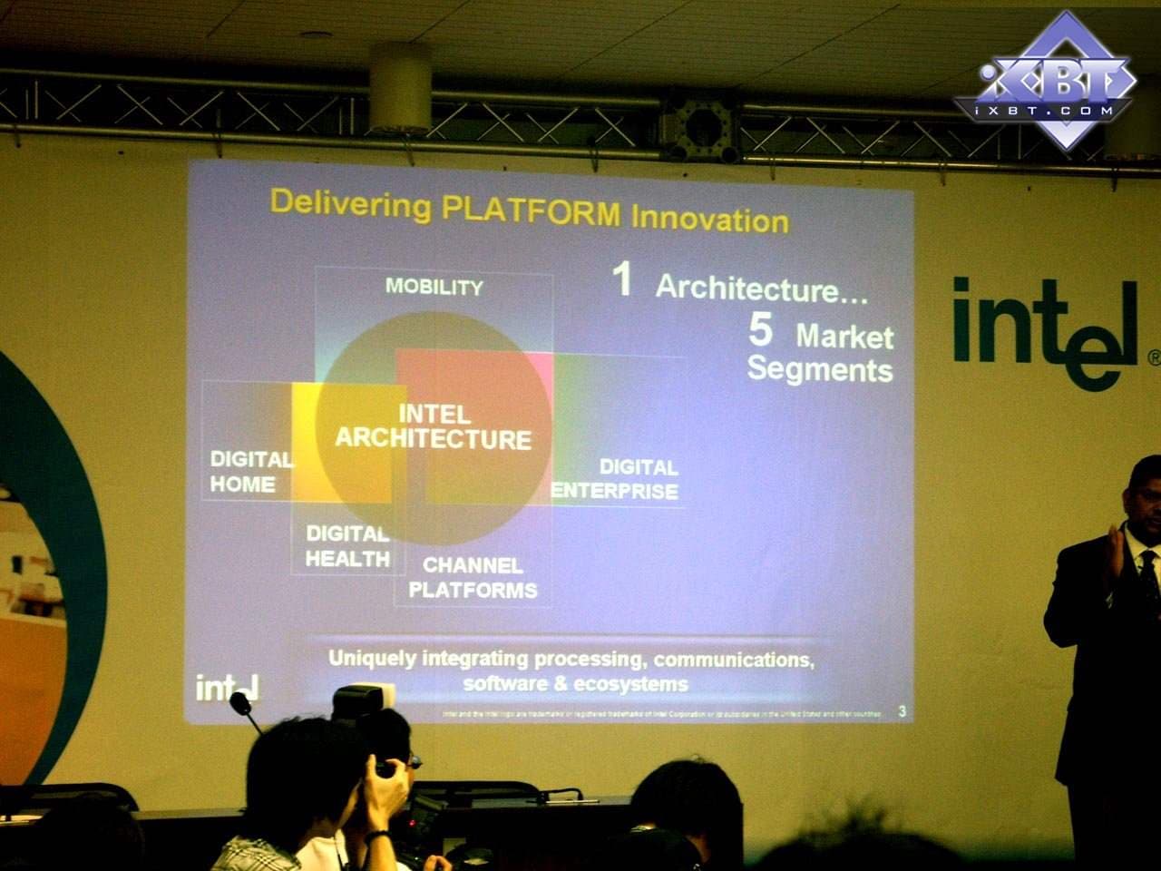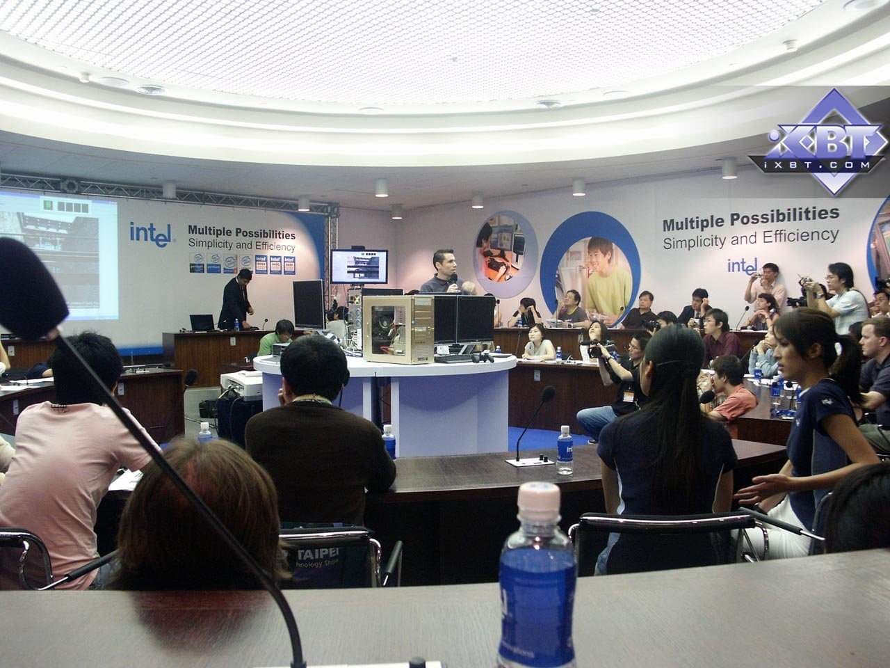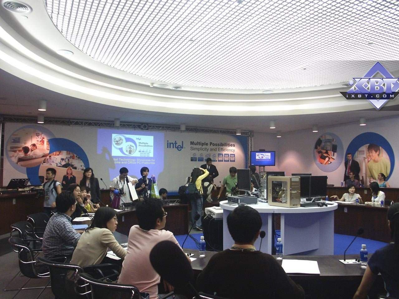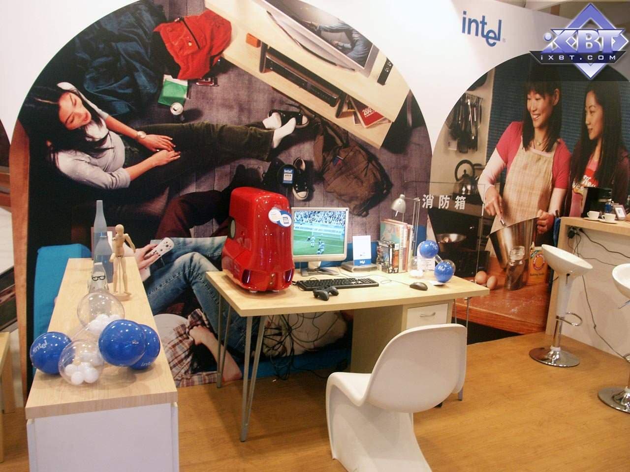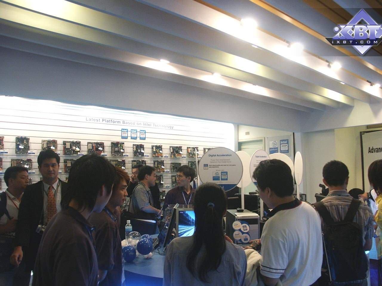 | Другой процессорный гигант Intel почему-то ограничился лишь залами во Всемирном торговом центре, павильона у него не было. Основным мотивом всей экспозиции и конференции в частности, была общность и единство архитектуры Intel для разных решений вообще даже в различных сферах. Доминировала, разумеется, идея цифрового дома, и это нам продемонстрировали помощники ведущего конференцию, моделируя всевозможные даже житейские ситуации, и как выйти из того или иного положения, имея в доме целую систему, управляемую компьютером, разумеется, на основе процессора от Intel. Другая идея, которую постоянно вносил в зал ведущий, это простота решений, чтобы даже не продвинутый пользователь мог разобраться в работе того или иного устройства. Как раз тут вовремя было подчеркнуто, что потому компания и ушла от частот процессоров, упирая лишь на производительность. |  |
