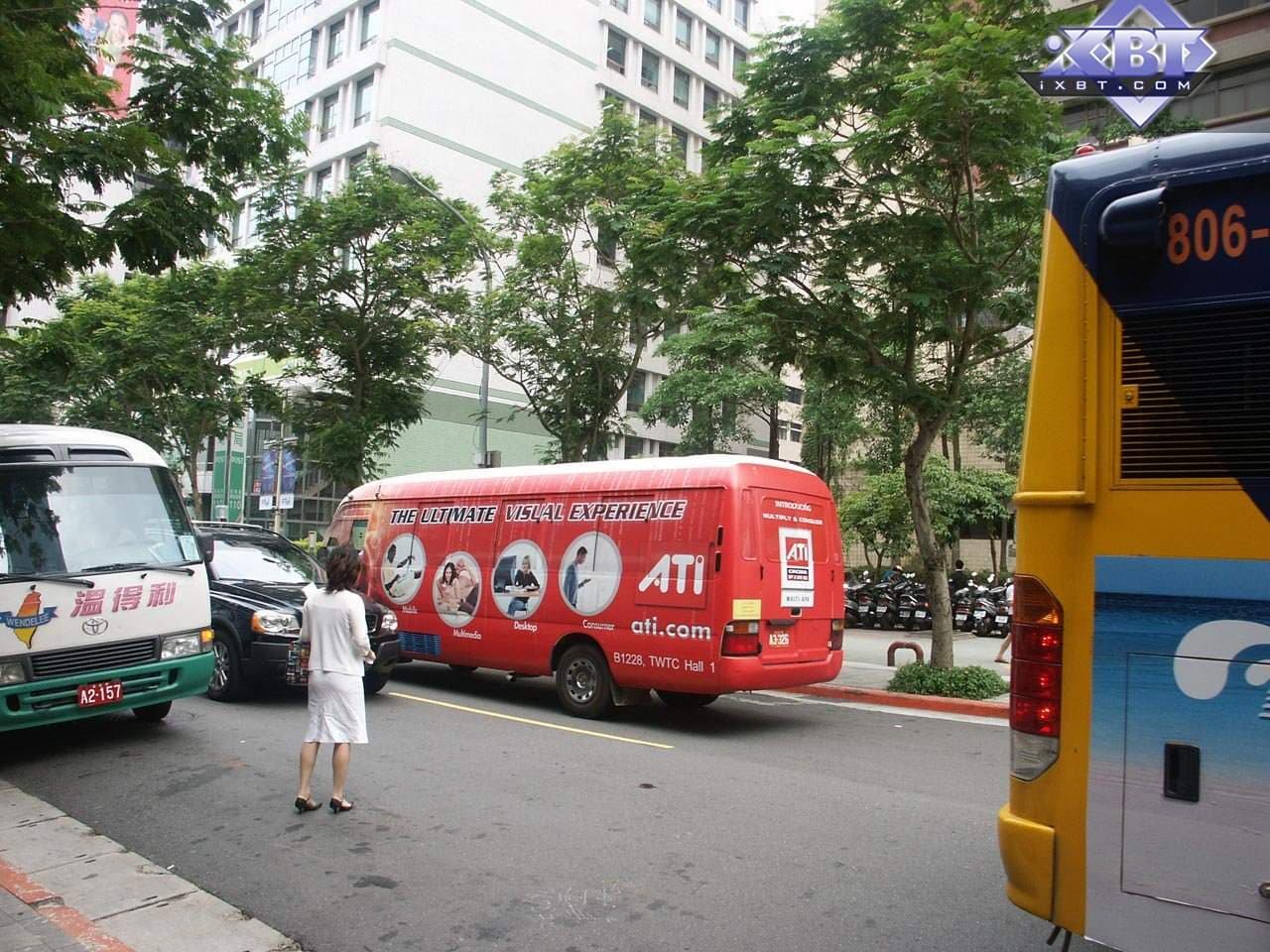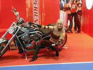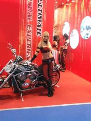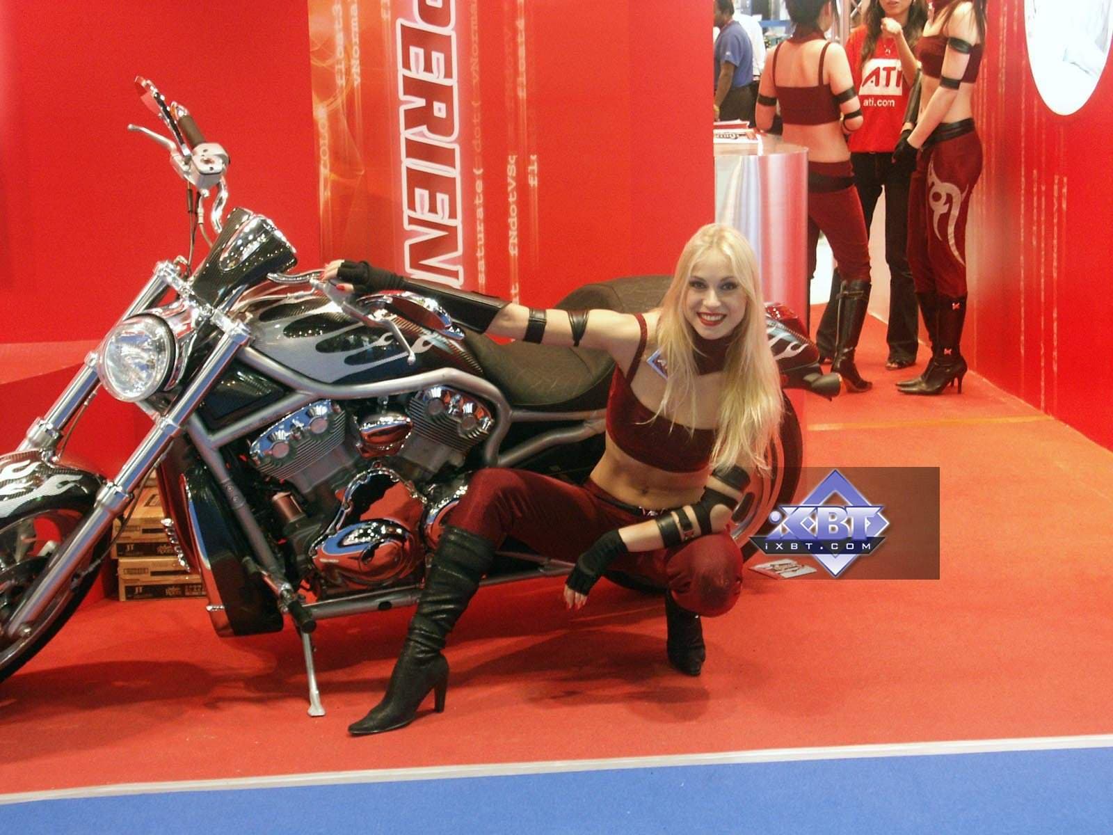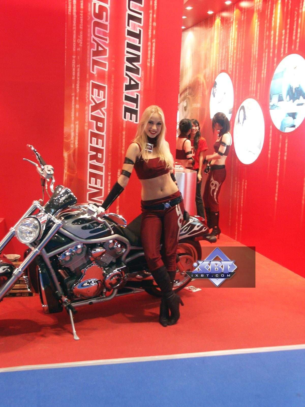 | Что касается нетленной с 1985 года красно-белой (не в плане «и нашим, и вашим» :) ) компании ATI Technologies, то она решила распылиться по выставке (помните из «Лоскутик и Облако», как Облако распылилось в виде тумана, и тогда его уже точно было не поймать, пришлось идти на хитрость). Так и ATI ограничилась небольшим отсеком в фойе отела, плюс во всех павильнах были небольшие.. эээ, танцплощадки (ну иначе не назвать), курсировал автобус с рекламой ATI, и на всех стендах партнеров ATI периодически проходило шоу от канадской компании. Но зато я впервые на выставке увидел европейскую красавицу (а не вечных китаянок с накрашенными глазами под европеек, а некоторых и с прооперированными глазами, чтобы ОЧИ БЫЛИ ШИРШЕ :-) ). От этой Ruby было просто глаз не отвести, да и чего говорить, треть павильона собрался на такое зрелище, когда она около мотоцикла выделывала очень эффектные пассы. |  |